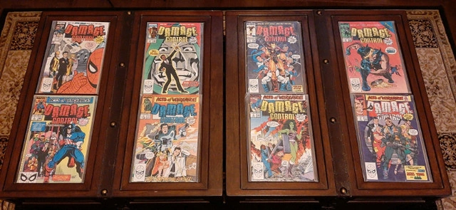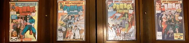 Damage Control is a fictional construction company appearing in Marvel Comics. The company specializes in repairing property damage caused by conflicts between superheroes and supervillains. A joint venture between Stark Industries and the federal government. 1st series includes 4 books $20. 2nd Series 4 books Acts of Vengeance $20.