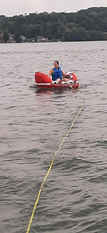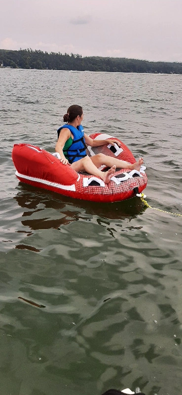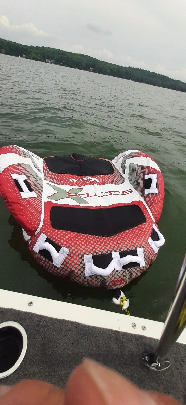 Before anyone asks, this does not include a pump or rope as those are typically purchased separately. Multiple riders can share aquatic adventures with the XPS® Sector X 2-Person Towable Tube. Features include 6 padded nylon handles with EVA knuckle guards, raised sides for extra stability, soft EVA pads for a comfortable ride, fully covered nylon and heavy-duty PVC material for enhanced durability, a Boston valve for rapid inflation/deflation, and an E-Z Connect attachment point.