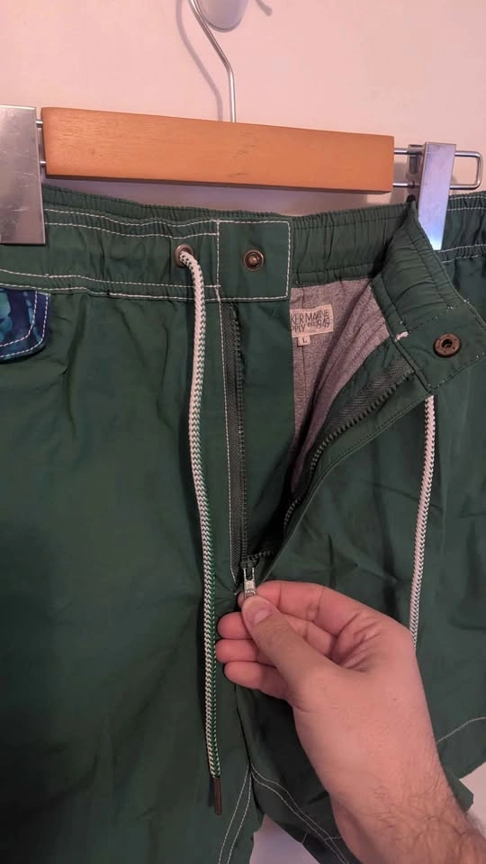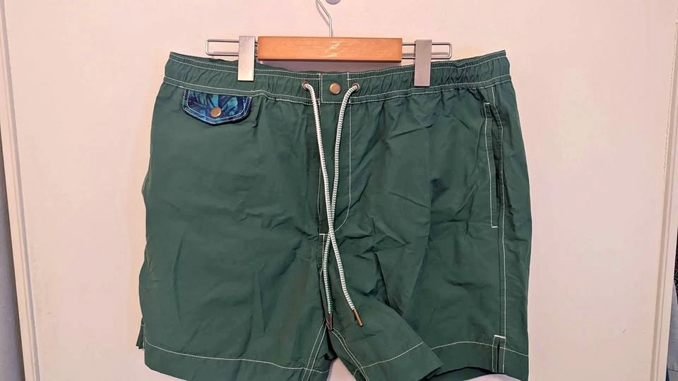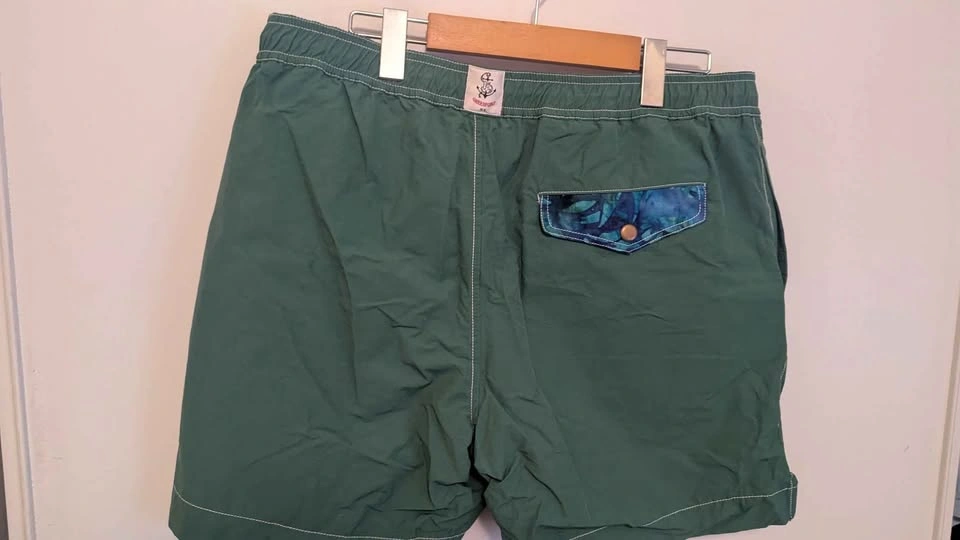 A very unique piece of athleisure for those who want an all day summer short for land and water. Pickups in East York or near St Andrew station on certain days. Check listing for other neat pieces! Men's Large Made in China 55% Cotton / 45% Nylon Measurements: 17 Inches measured from side of short to other side - could stretch to 18 (34-36 inch waist) 6 Inch Inseam measured from crotch seam of garment to leg seam 11.25 Inch rise measured from crotch seam of garment to top of short Cool blue floral accent to the piece, lining appears good. These are a lined short and feel like a quality pair of board shorts/swim trunks.