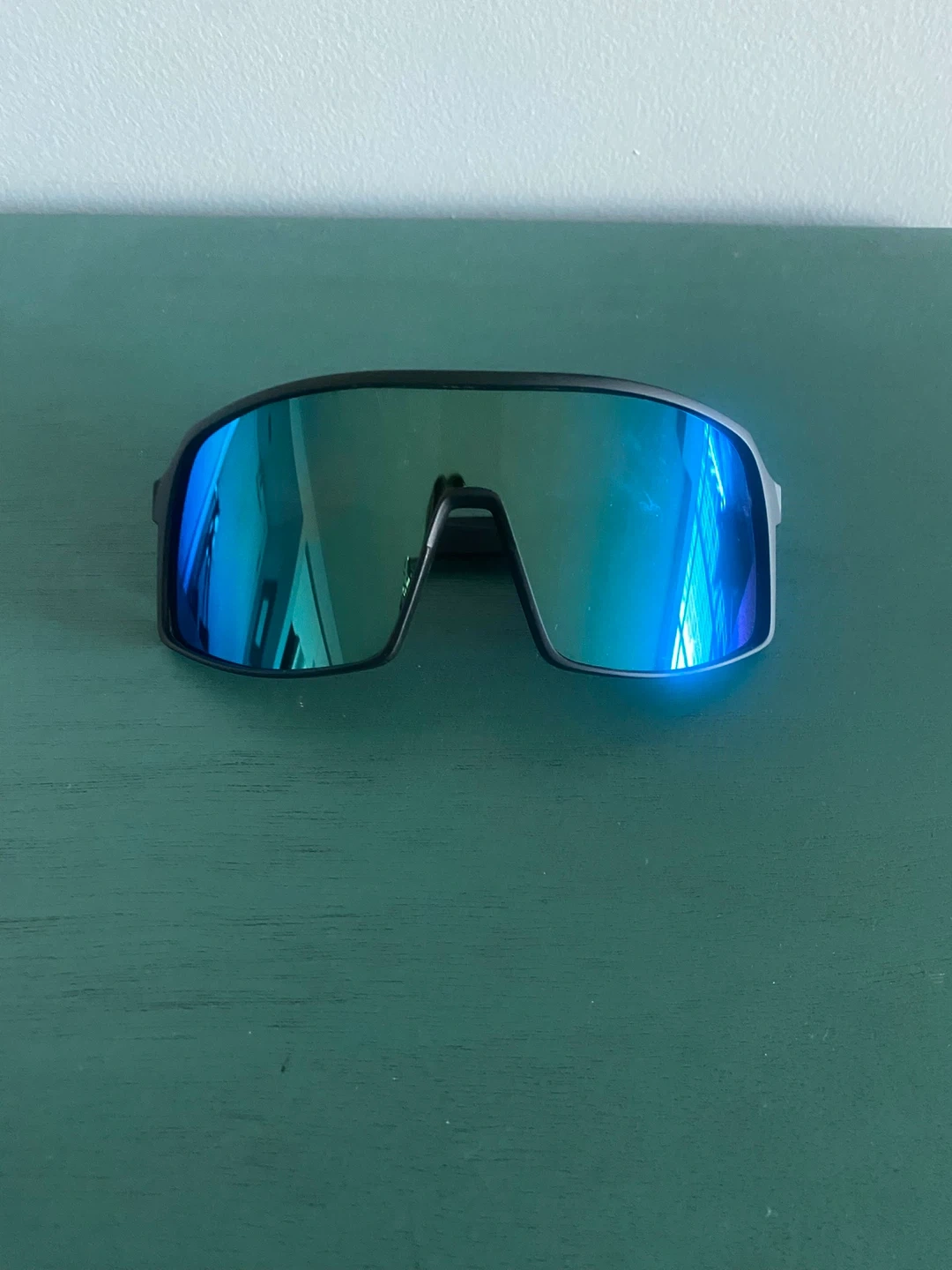 Selling a pair of sunglasses with black frames and blue lenses! These sunglasses are lightweight and provide excellent protection from the sun. Great for men or women.