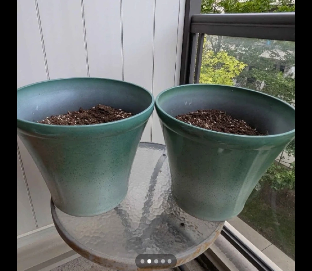 Giving two good-sized round plastic planter pots. They are approximately 13 x 15 inches.