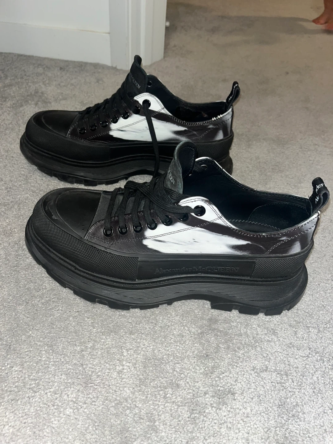 Selling a pair of Alexander McQueen Tread Slick shoes in size 8. They are in great condition and have a stylish, unique design. Perfect for adding a touch of luxury to your everyday look!