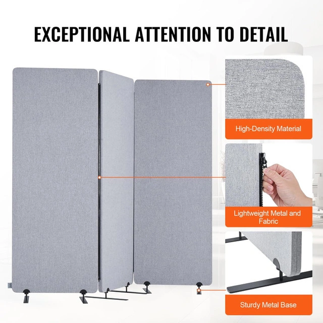 Brand new room divider. It comes in original open box with legs. Retails at Amazon for $601 ($540 + tax). Save your money. * Two sets available. Price per set of 3 panels. Pickup from south London. I can deliver in London for an extra fee. VEVOR 2FT Room Divider, 3 Panels PET Polyester Soundproof Room Screen, Folding Privacy Divider Portable Partition Divider for Room Separation, Freestanding Partitions for Office Study, Light Grey Product details: Product Dimensions: 184W x 165.5H Centimetres Brand: VEVOR Style: Folding Room Divider Colour: Light Gray Number of panels: 3 Material: Polyethylene Terephthalate (PET) Your Personal Space: This 3-panel soundproof room divider (72.4×13.7×65.2 in / 1840×350×1655 mm) is perfect for setting up your own office space in a public area without disrupting the existing layout. It helps reduce unnecessary distractions and is ideal for use in offices, schools, hospitals, bedrooms, living rooms, kitchens, and other indoor spaces. PET Soundproof Material: Our folding room divider features upgraded PET soundproof fabric, absorbing up to 85% of environmental noise. Combined with soft padding, it enhances privacy, heat insulation, breathability, and light-blocking properties, creating a quiet workspace and a perfect backdrop for online meetings. Personalized Decor: This room screen isn’t just a partition—it’s a work and decor wall! Attach to-do lists, memos, or reminders to track work progress, and personalize it with photos, postcards, or other items to create an organized and unique workspace filled with personality. Flexible Configuration: With a zipper connection, this room divider screen can be used as a single panel to create temporary meeting or live streaming backgrounds in tight spaces. Alternatively, you can combine multiple panels to create a larger portable temporary wall, perfect for large-scale partitions or blocking out strong sunlight from windows. Easy Assembly & Mobility: With all necessary parts and clear instructions included, the partition room dividers can be assembled in about 15 minutes without drilling—just zip the panels together and insert the iron pipe parts into the bottom holes. It’s recommended to have two people for easier assembly.