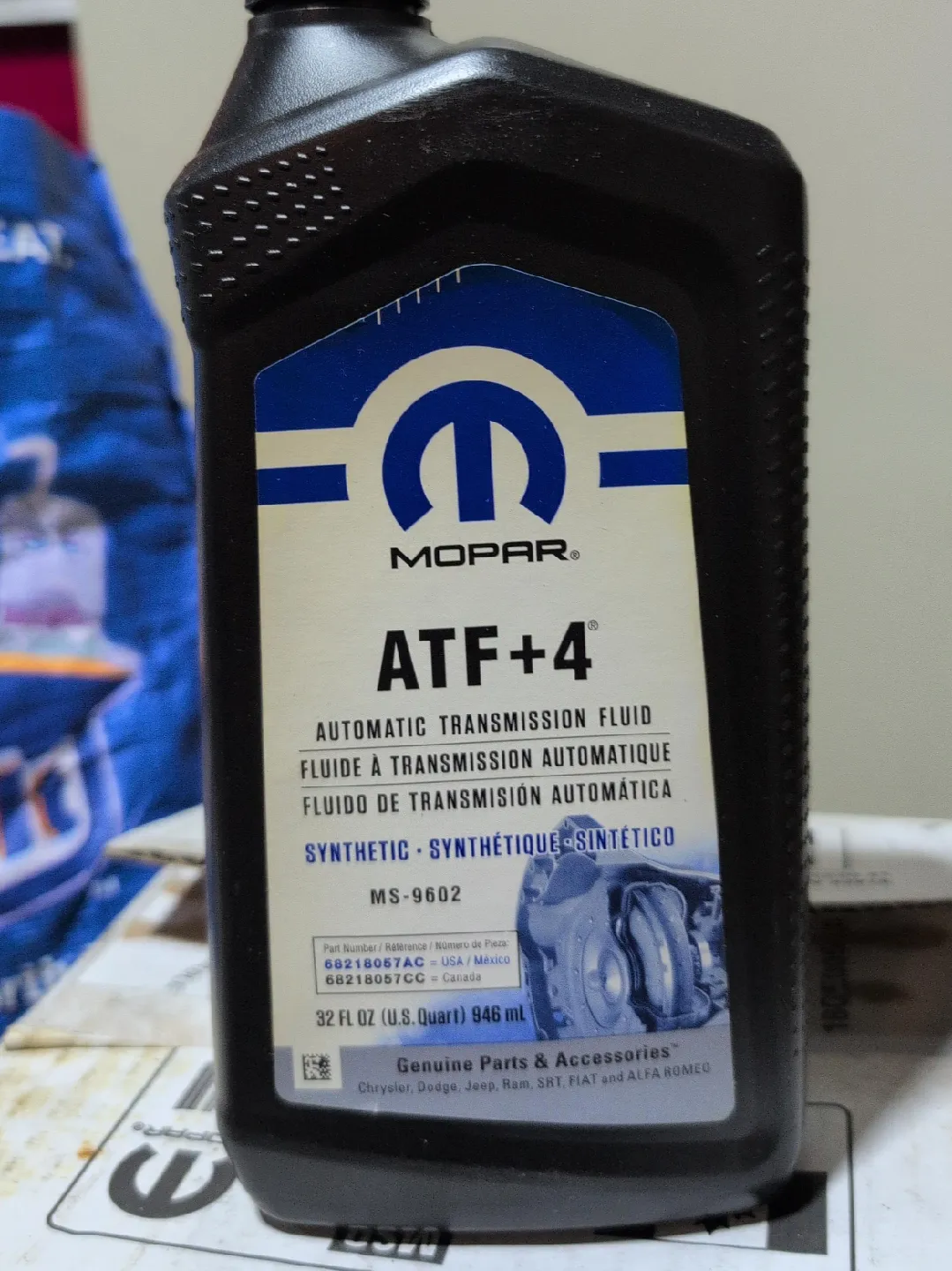 Selling a bottle of Mopar ATF+4 Automatic Transmission Fluid. It's a synthetic fluid and comes in a 32 fl oz (U.S. Quart) / 946 ml bottle. Perfect for Chrysler, Dodge, Jeep, Ram, SRT, FIAT, and Alfa Romeo vehicles. brand new