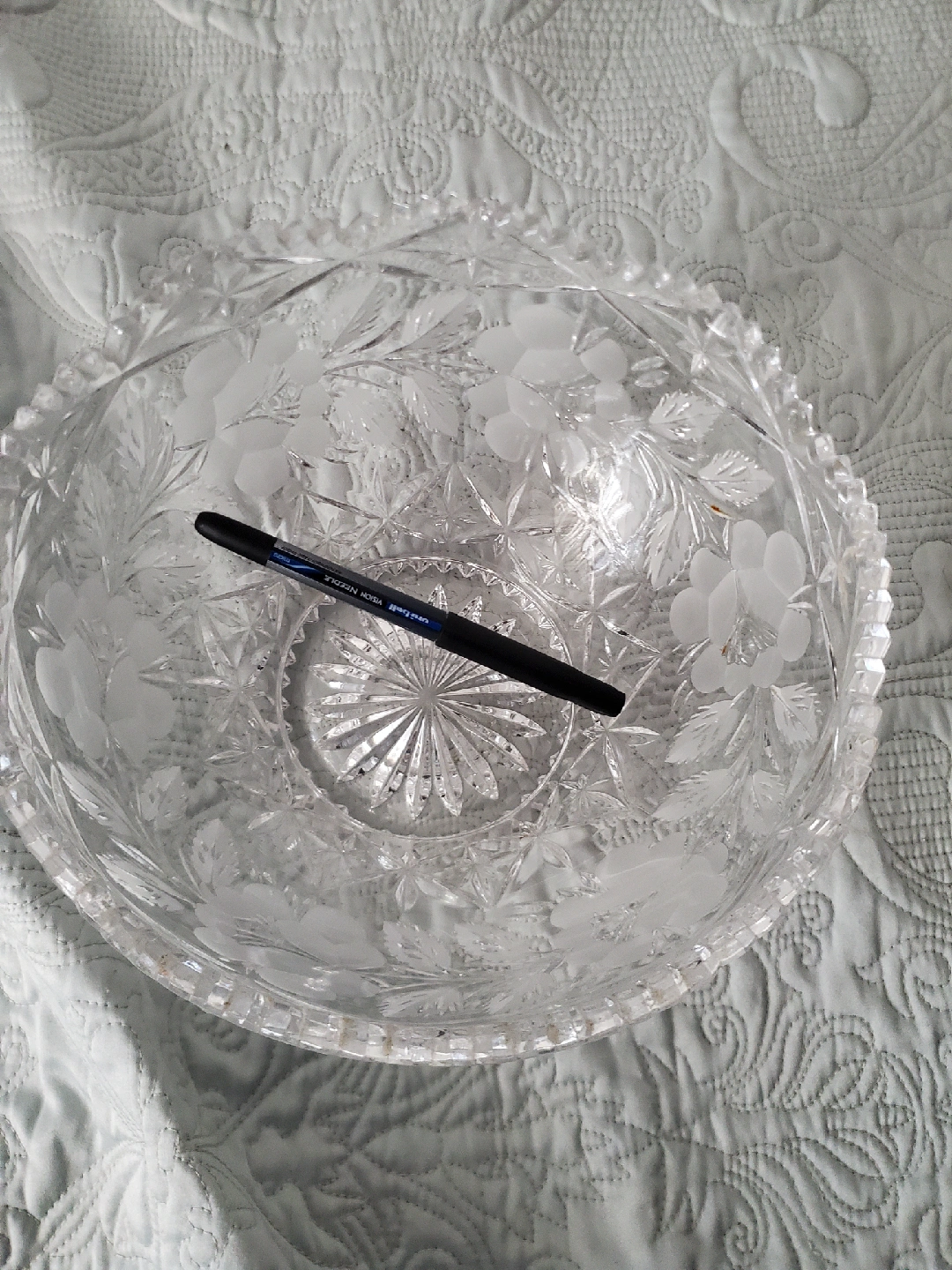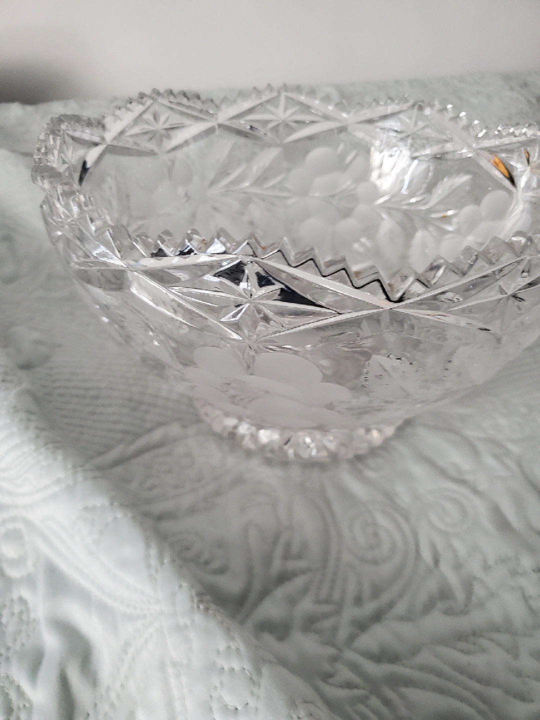 Selling a beautiful vintage crystal bowl! It features a lovely floral design and intricate detailing. Perfect as a decorative piece or for serving. minor chip. see photo 3.