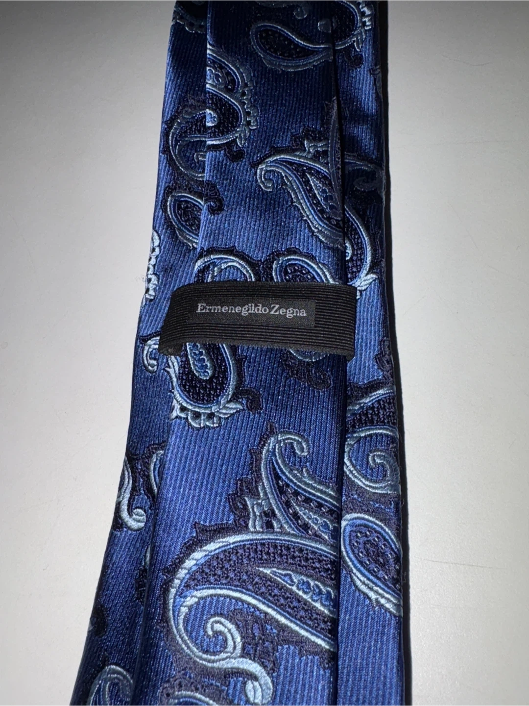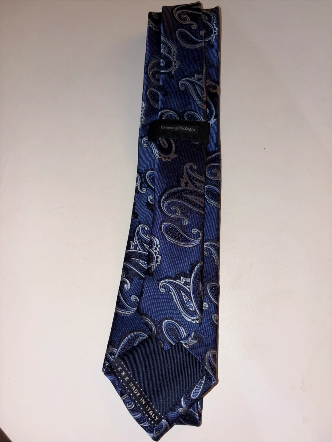 Looking to sell a stylish Ermenegildo Zegna tie! It features a beautiful blue paisley pattern and is made in Italy. A great addition to any wardrobe!