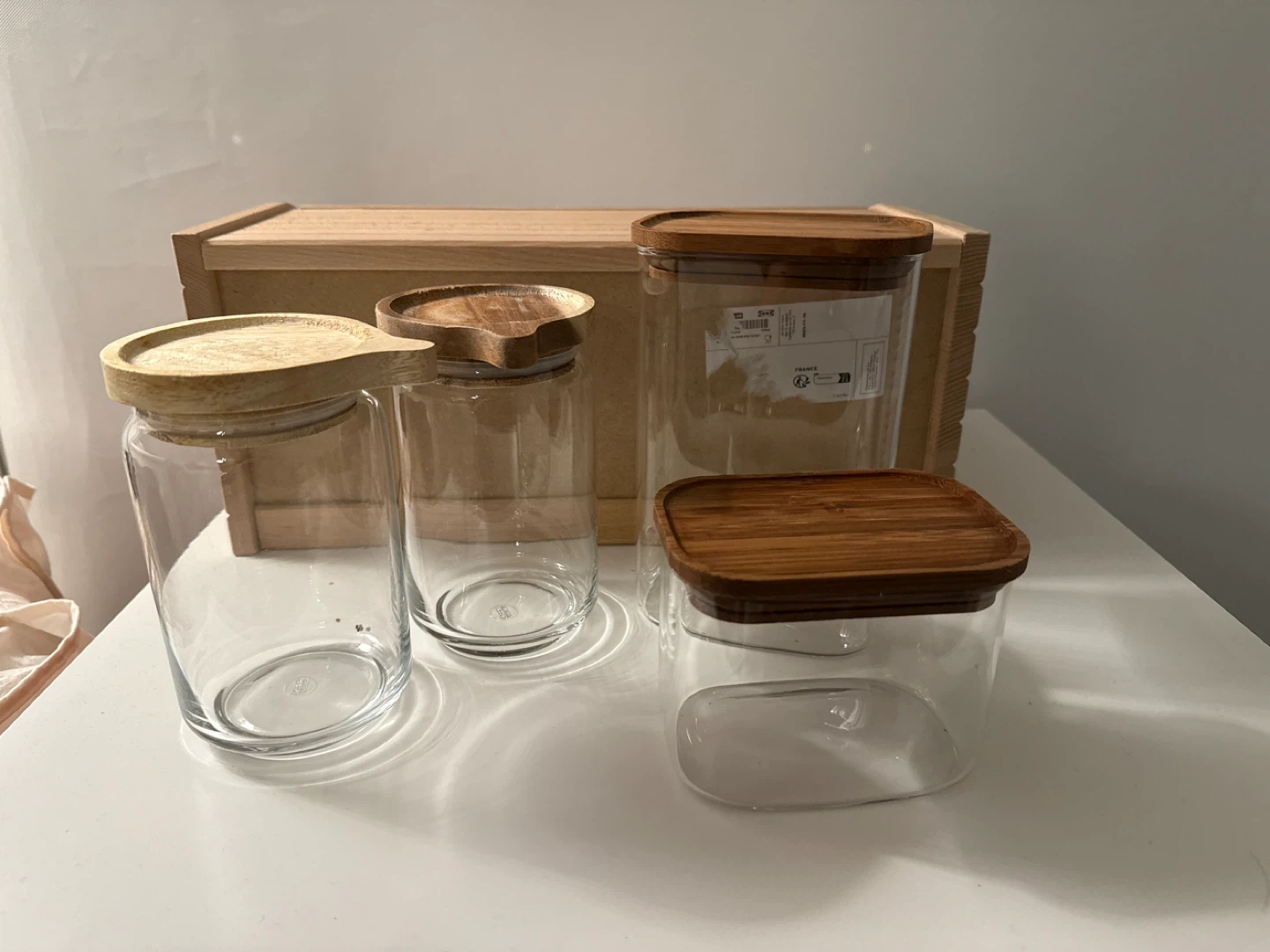 They have glass bodies with bamboo lids, perfect for storing your pantry staples. Includes a mix of round and square containers. Great for keeping your kitchen organized!