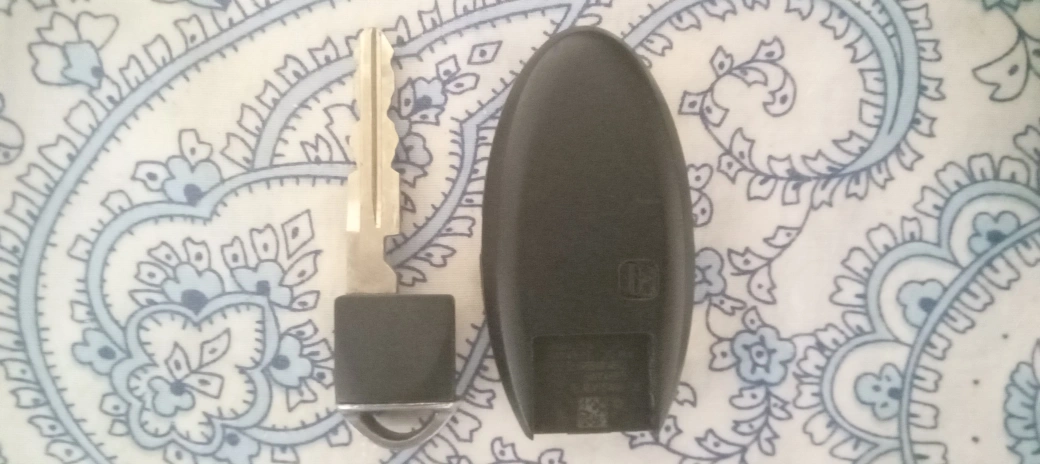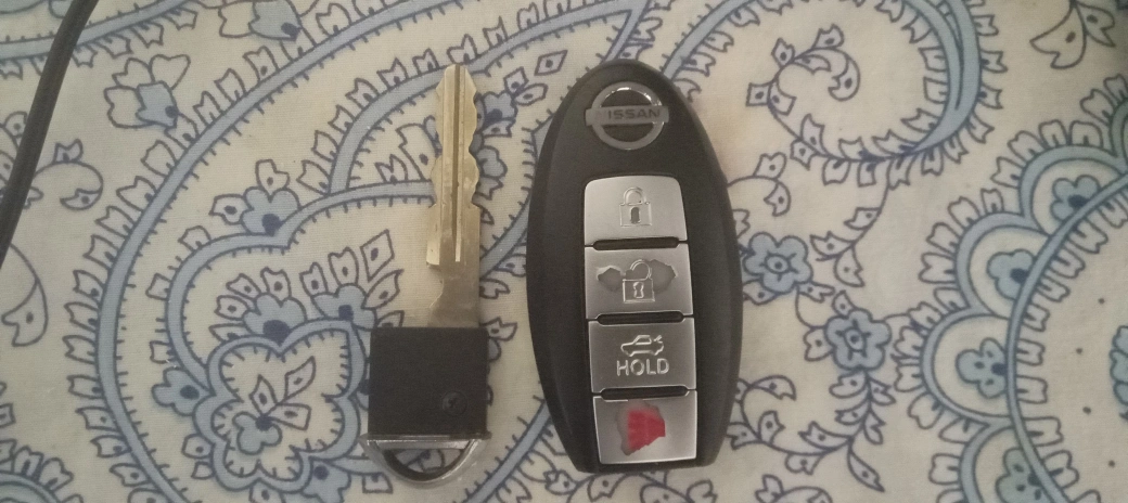 Selling a used Nissan car key fob. It has buttons for lock, unlock, trunk, and hold. Good to have as a spare or replacement!