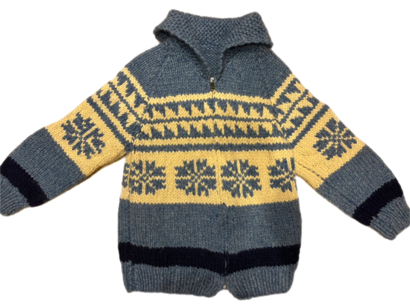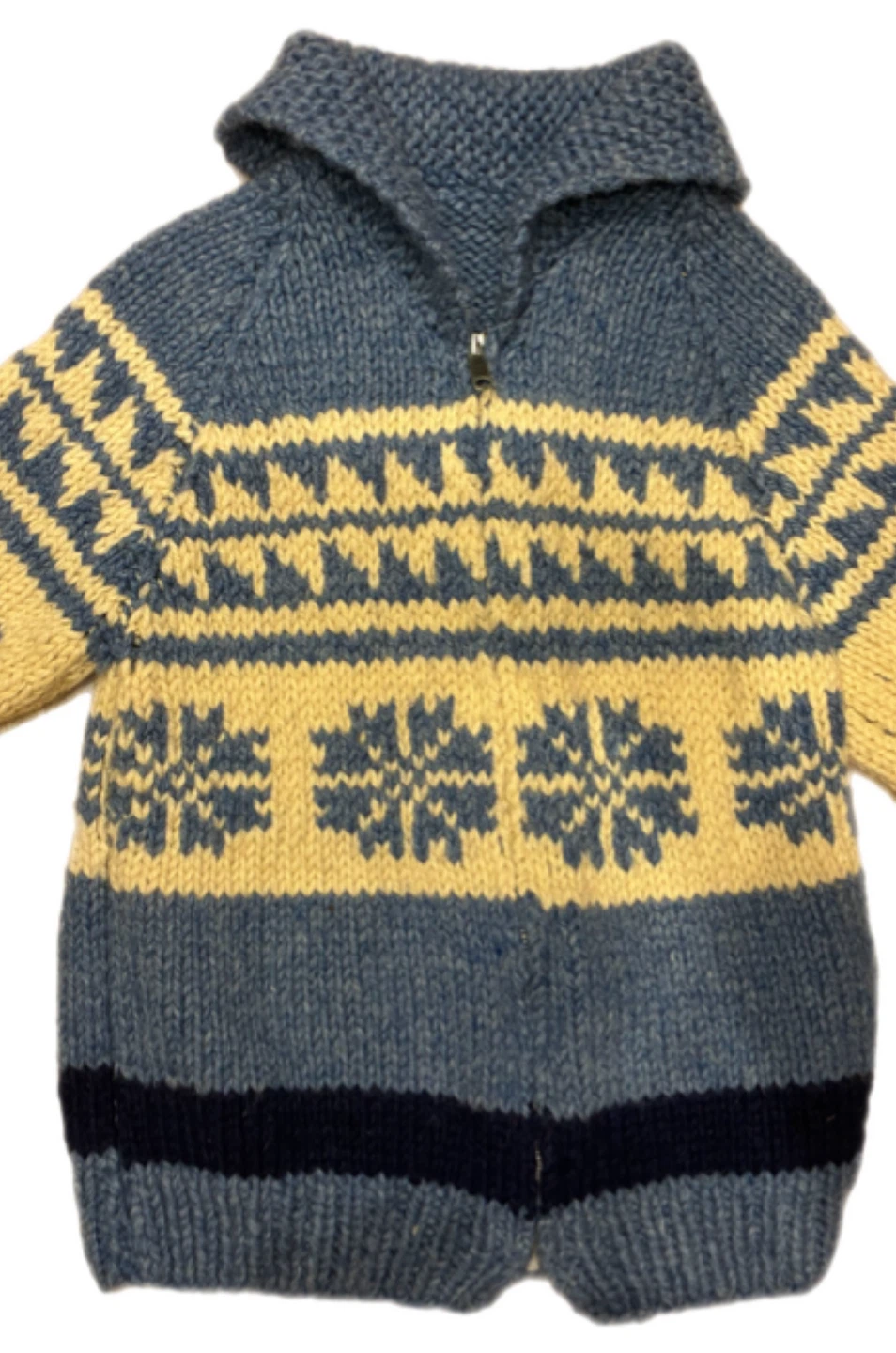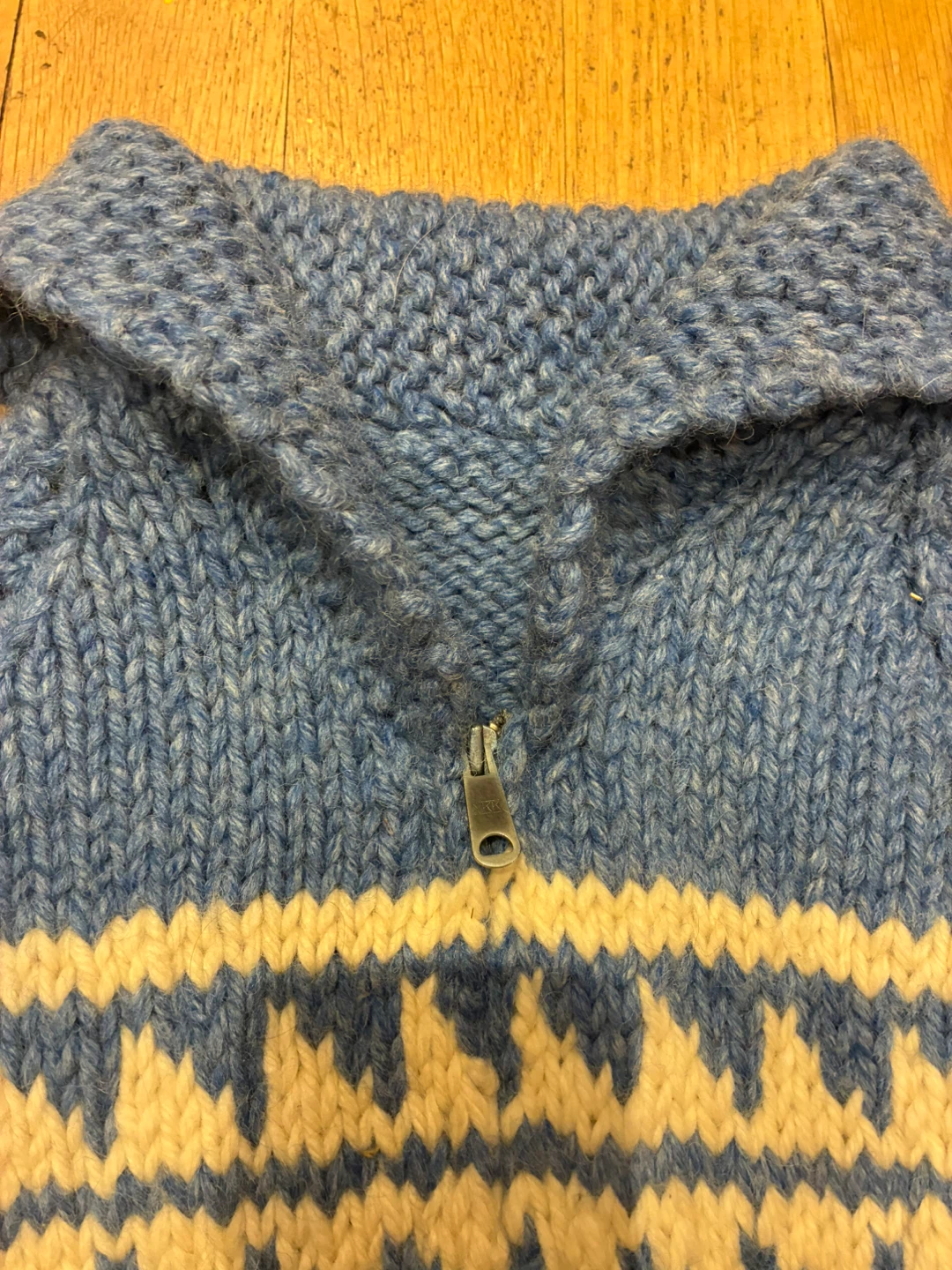 Cozy hand-knitted wool sweater, perfect for chilly days! It features a unique Nordic pattern in shades of blue and cream, with a full zip-up front and a comfy collar. Great for layering!
