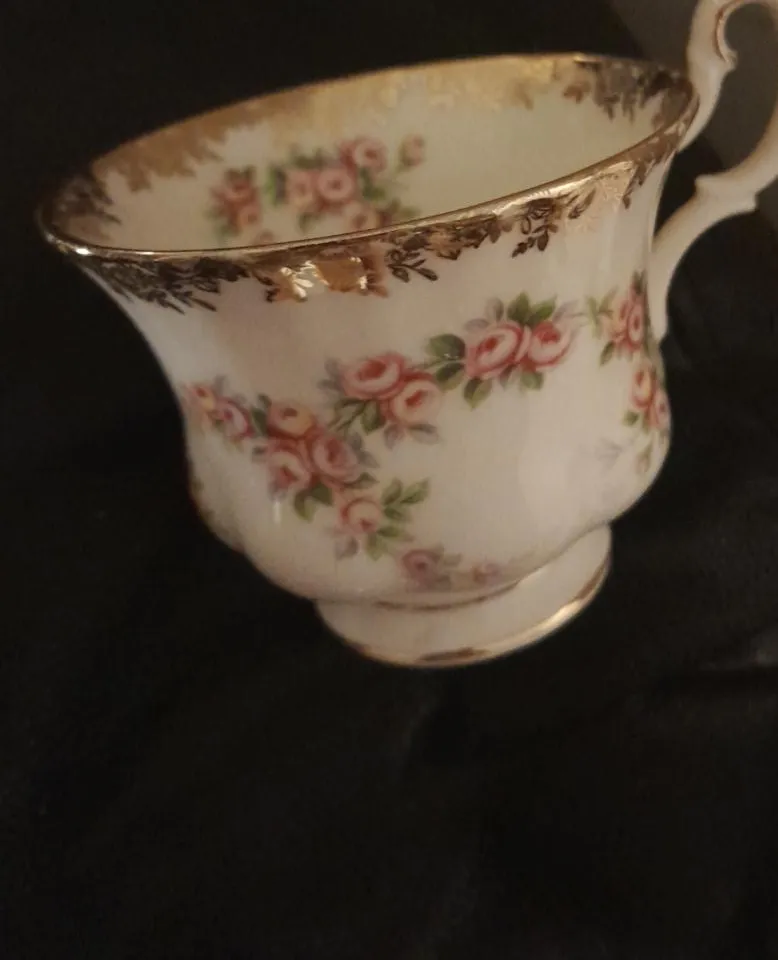 Selling a lovely Royal Albert teacup! This teacup features a beautiful vintage rose design with gold trim. Perfect for adding a touch of elegance to your tea time or as a charming addition to your collection. There's a small chip on the gold trim, as shown in the close-up photo