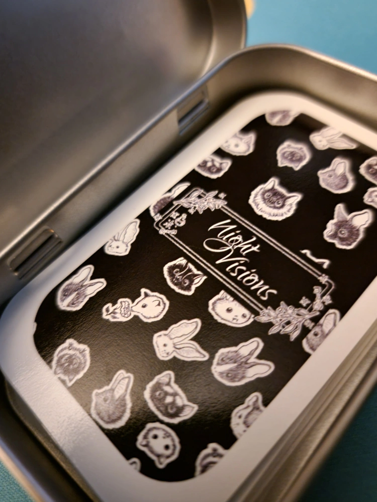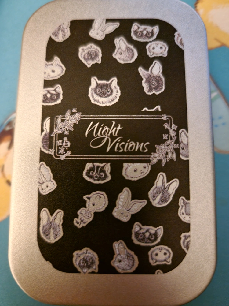 Night Visions oracle cards by Cat Mallard! They come in a metal tin and are in great condition. The cards feature unique illustrations and thought-provoking words to help guide your intuition and provide insight. Perfect for anyone interested in oracle cards and divination.