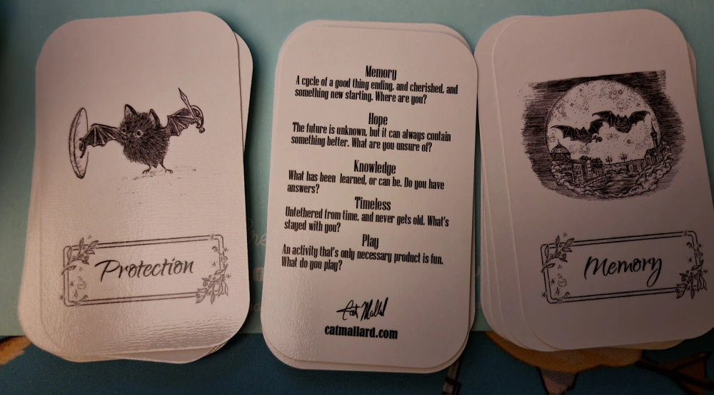 24 bat themed Oracle cards fit into an Altoid size tin plus 2 interpretation cards.