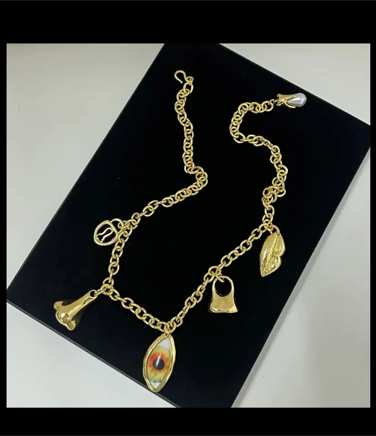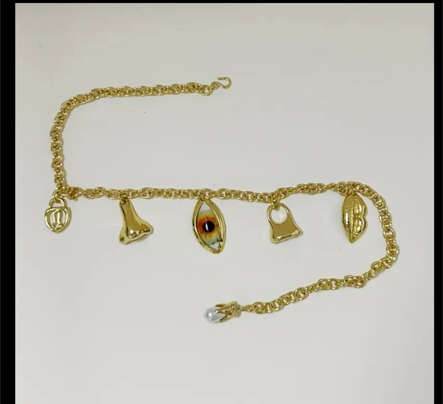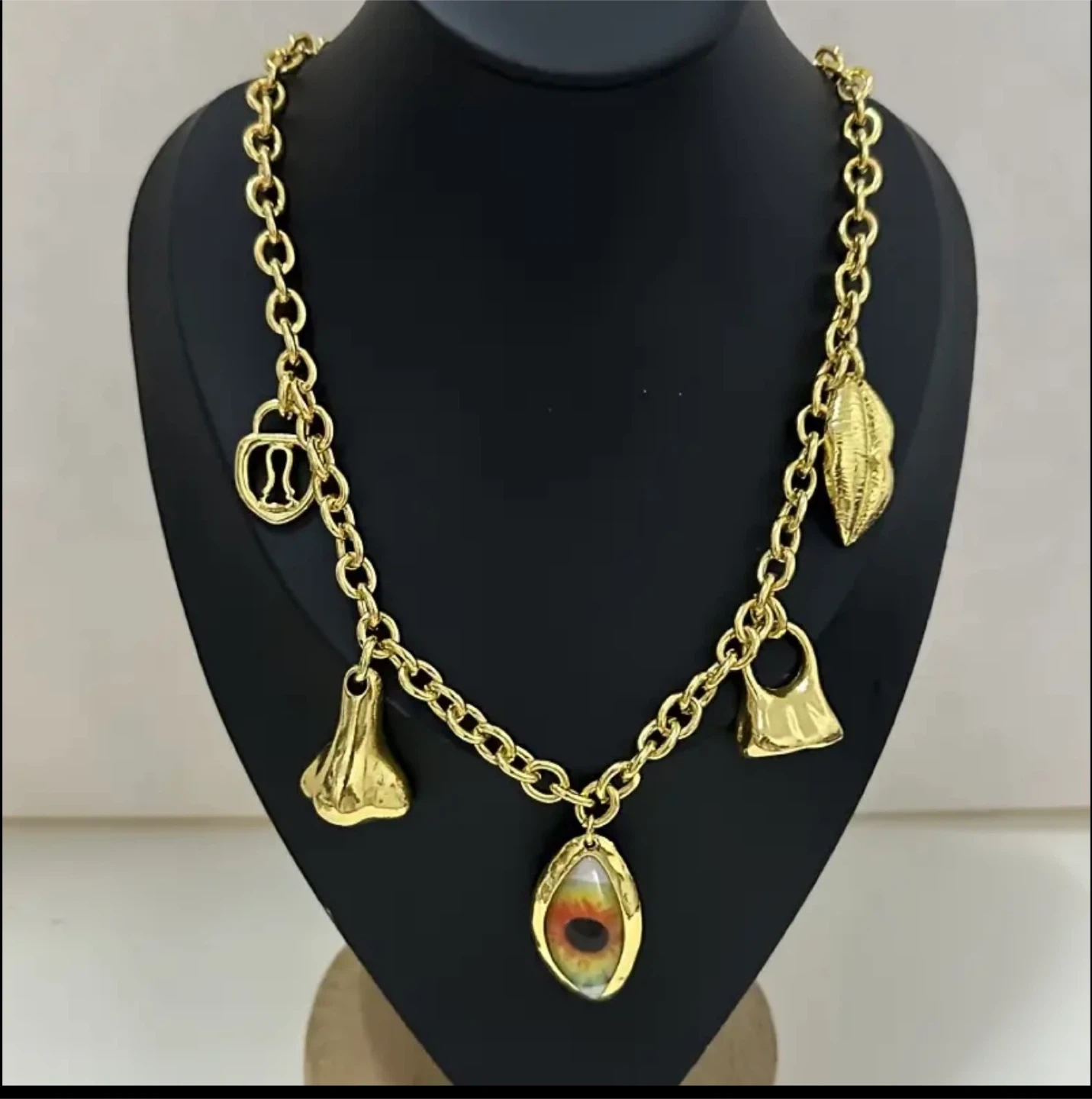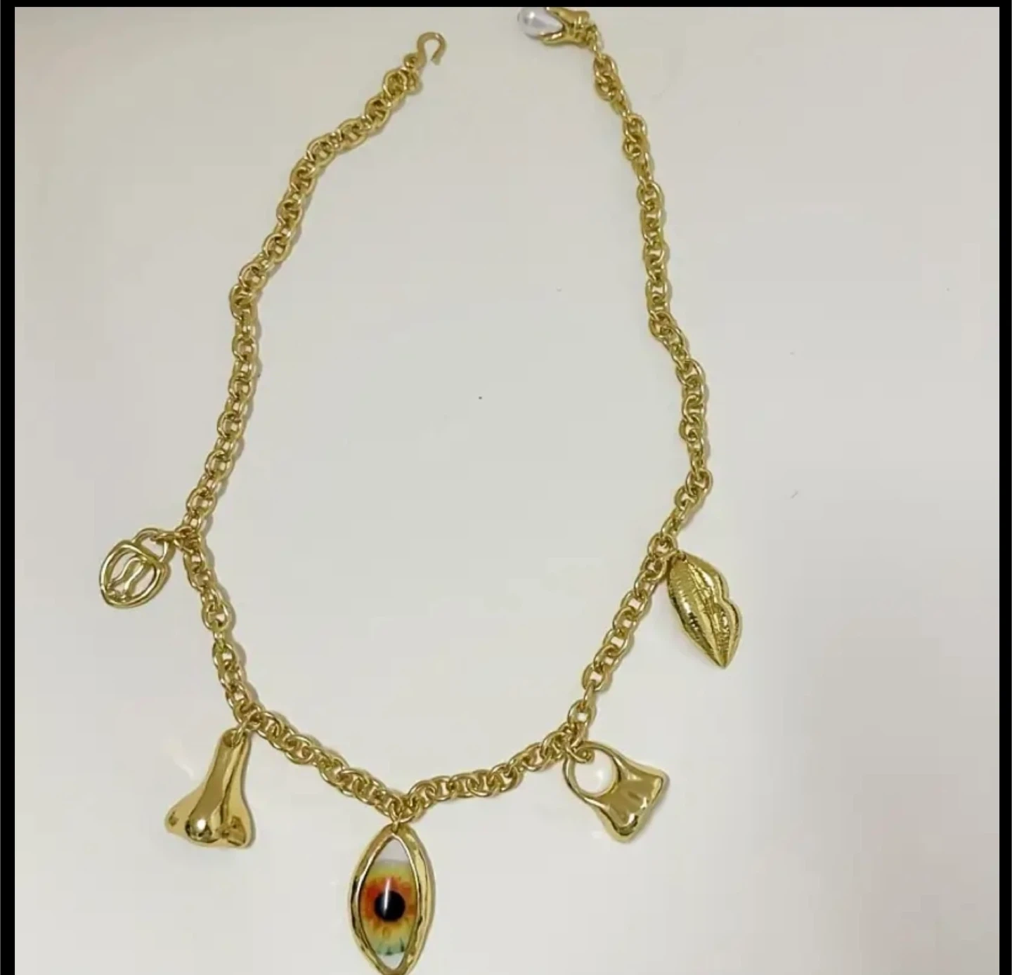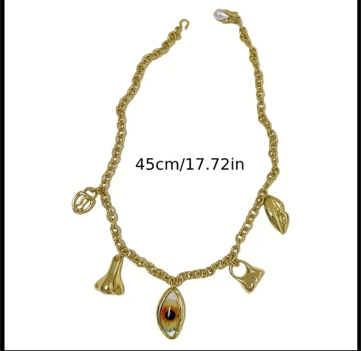 Selling a unique gold-colored charm necklace! It's approximately 17.72 inches long and features several interesting charms, including an eye, nose, and other unique shapes