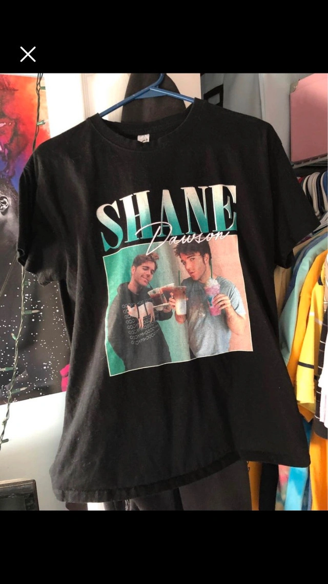 Brand new Shane Dawson space pig shirt $25 medium. Shane Dawson shirt $20 large (fits like medium). Also have both his books and epic sunglasses with case if interested. Both shirts together $30
