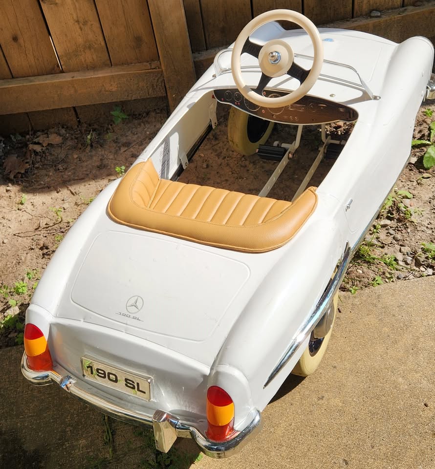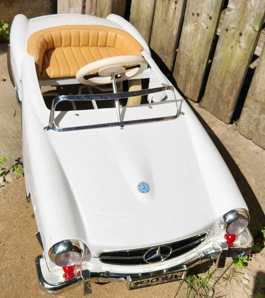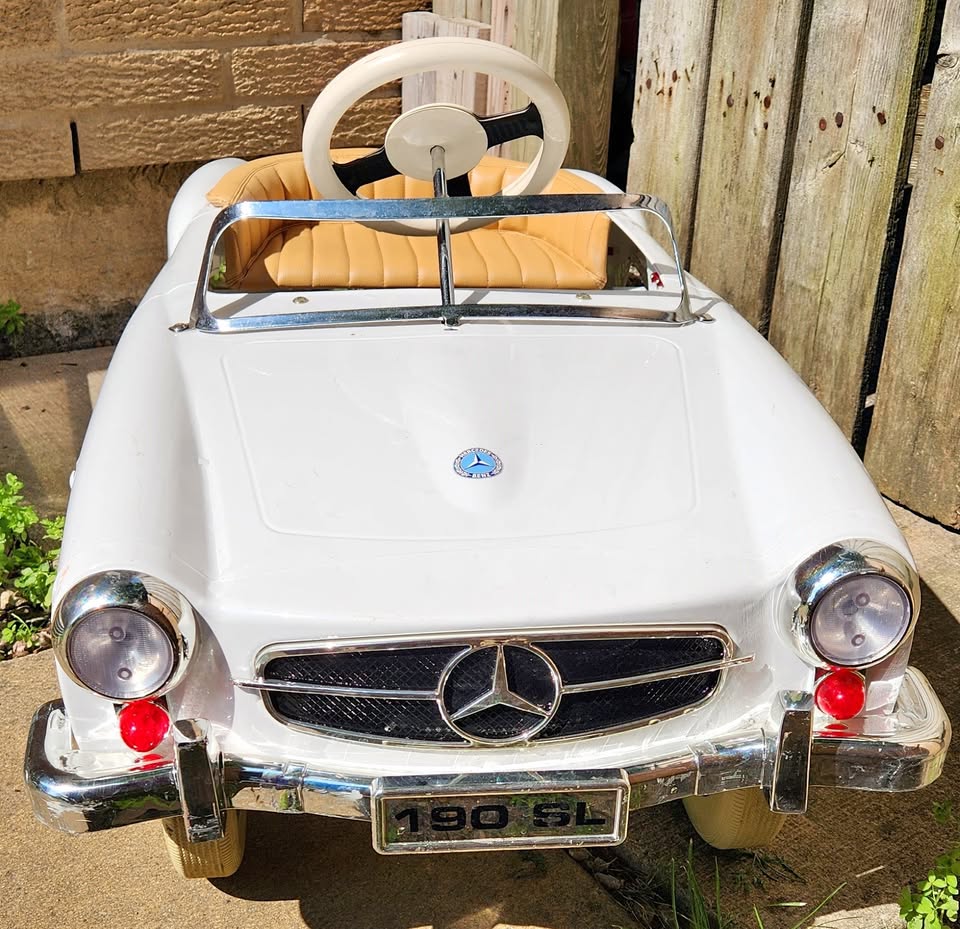 Modeled on the famous Mercedes-Benz 190SL that debuted in 1955, this car is powered not by the straight-four, single overhead cam engine of the original, but by pedal power. The car is made with the attention to detail and quality one expects from its adult counterpart: heavy gauge, stamped steel body; solid rubber wheels for a smooth ride; shiny chrome trim and hubcaps; and a padded bench seat. Five adjustable pedal positions ensure that young legs can reach comfortably and confidently. Ages 3 to 5, up to 50 lbs. 19" H x 20" W x 45" L. (35 lbs.)