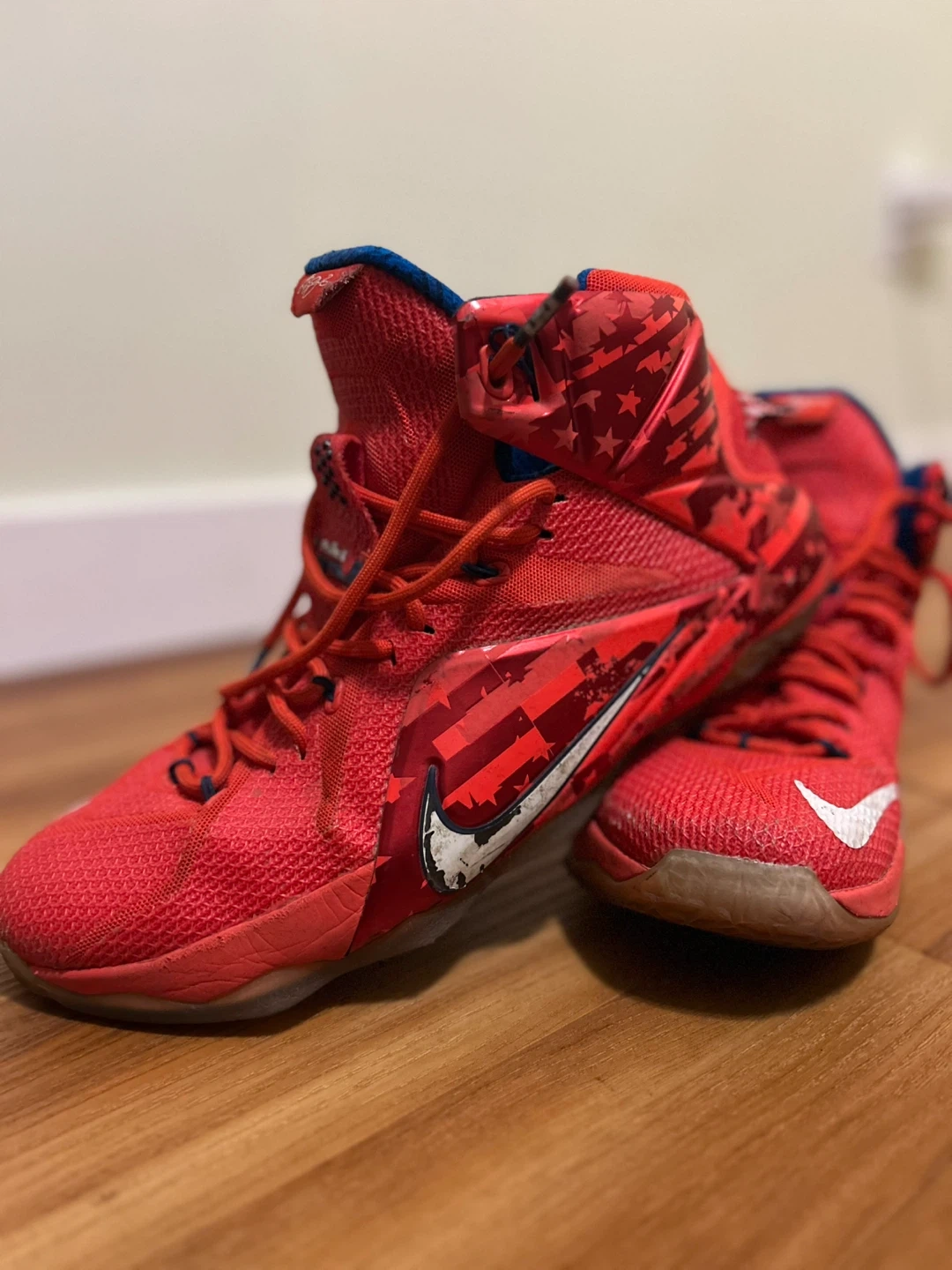 Selling a pair of Nike LeBron 12 basketball shoes in red. They have a cool design with stars and stripes. Great for playing ball or just rocking a sporty look!