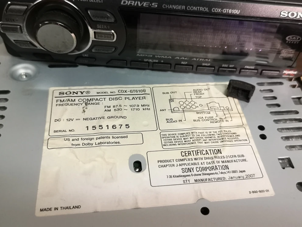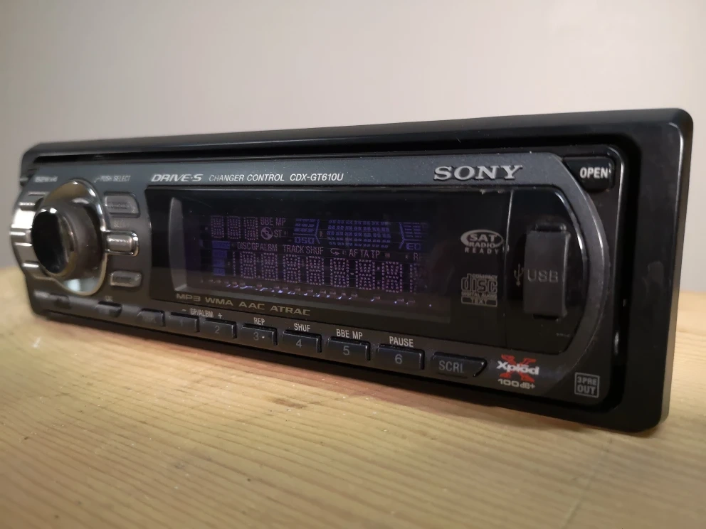 The Sony Xplod CDX-GT610U is a single-DIN car CD receiver known for its wide support for external audio sources like iPods and USB devices, which was a notable feature when the unit was released around 2007. It was praised as a cost-effective and user-friendly option. It has a detachable faceplate and a dot-matrix fluorescent display with blue backlighting.