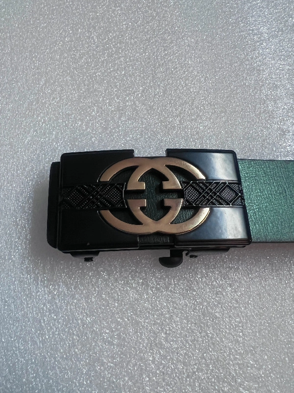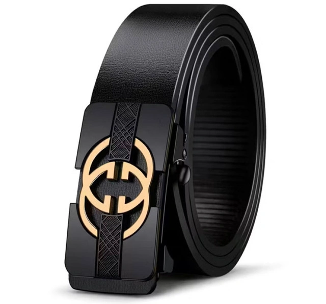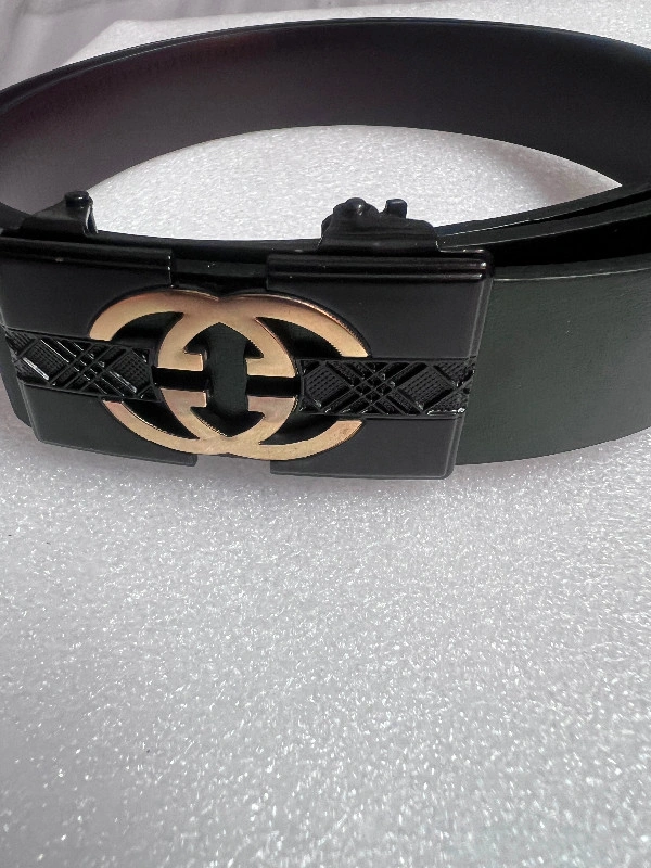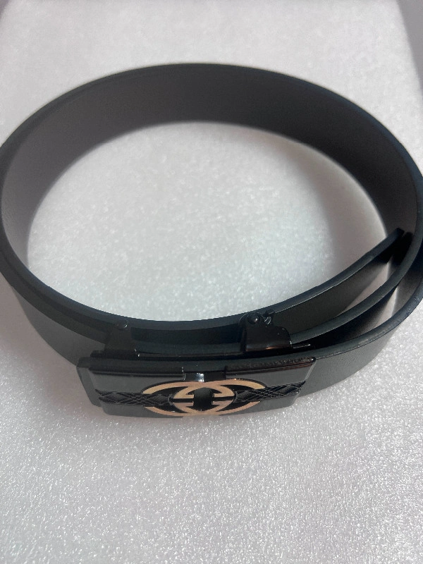 73For sale: New Designer Gucci Black Leather Belt with Auto Adjustable Lock. Leather belts are sure to last for a long time, as they are made from premium high quality genuine leather. Stylish gold buckle lends them unique charm. Finish off your dress look. ++Product Features: Men leather belt Modern look, brushed gold buckle Highest quality leather Belt is 1.25” wide Heavy gold plated Length: 44" Fit waist size from 30"-38". Condition: New For Sale By: Owner