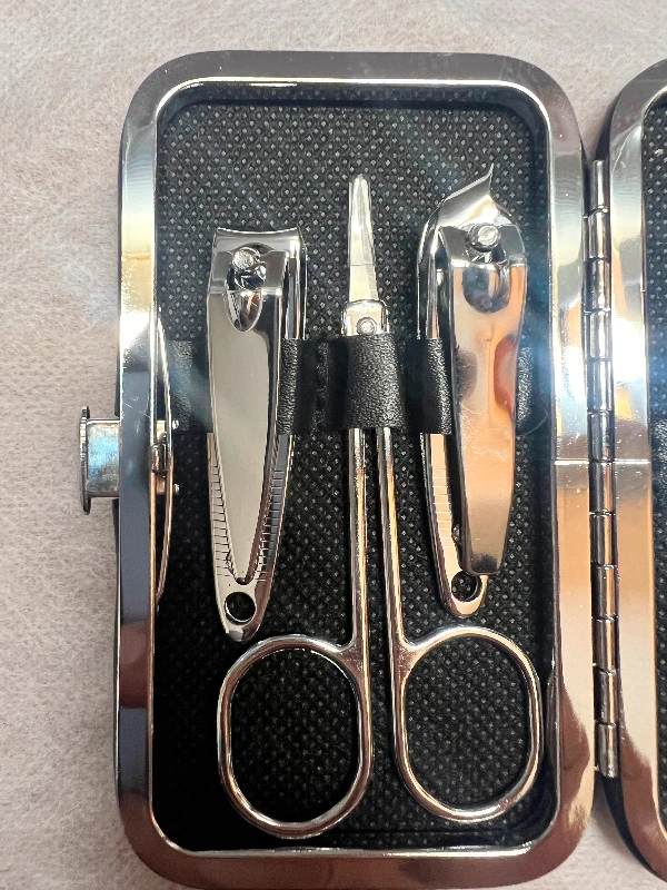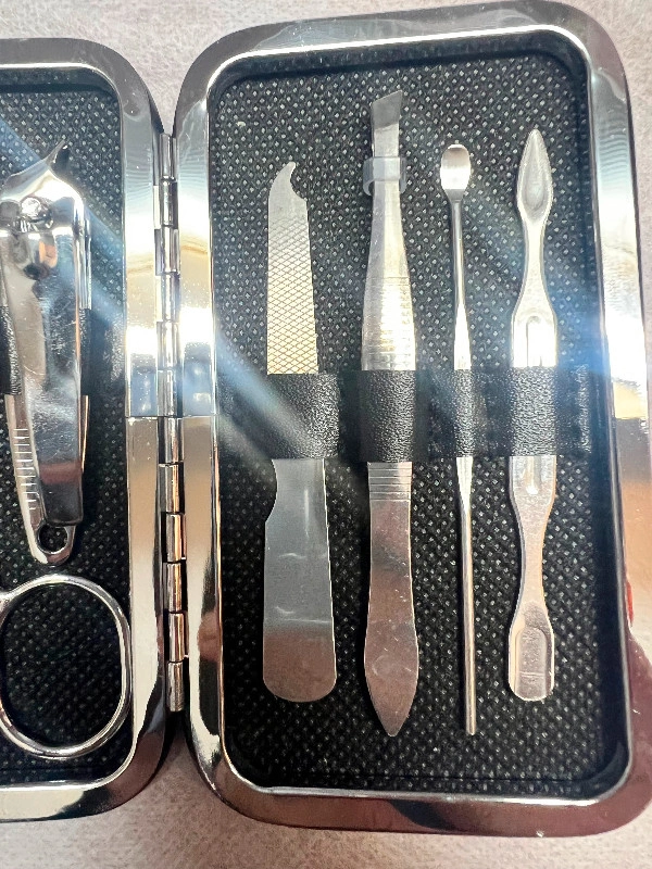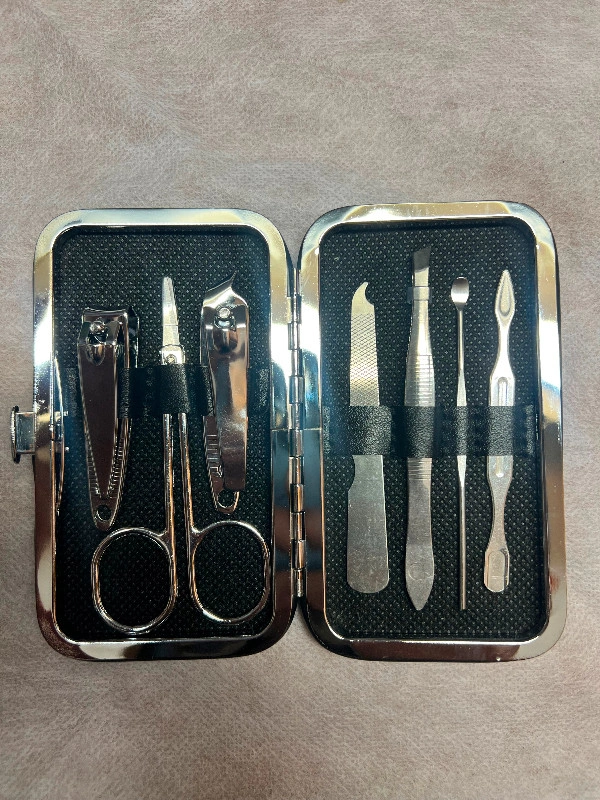 73For sale: brand new Professional Nail Care kit with travel case. 7-piece kit includes nail clipper, diagonal nail clipper, multi-purpose scissor, ear pick, single-edged double-sided push stick, eyebrow tweezer, and V-shaped push stick. Lightweight & portable: Comes with a stylish case to protect the sharp tools. Easy to open and close with a secure snap closure. The case is 3 inches by 6 inches, perfect for travel or home use. Made of top high steel, sturdy and built to last. For your health, it's best to use your own nail care kit as a separate tool for your fingers and toes. Keep a good nail care habit by putting all tools back into the case and in a dry environment when not in use. Cash accepted.