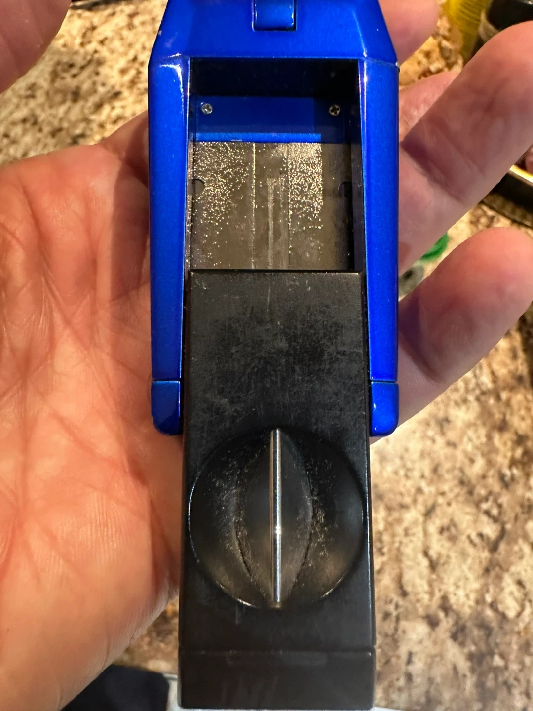 This Colibri lighter has a triple flame torch. It features a v-cut. The body is blue and black.