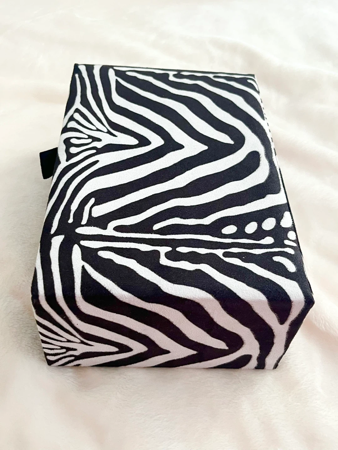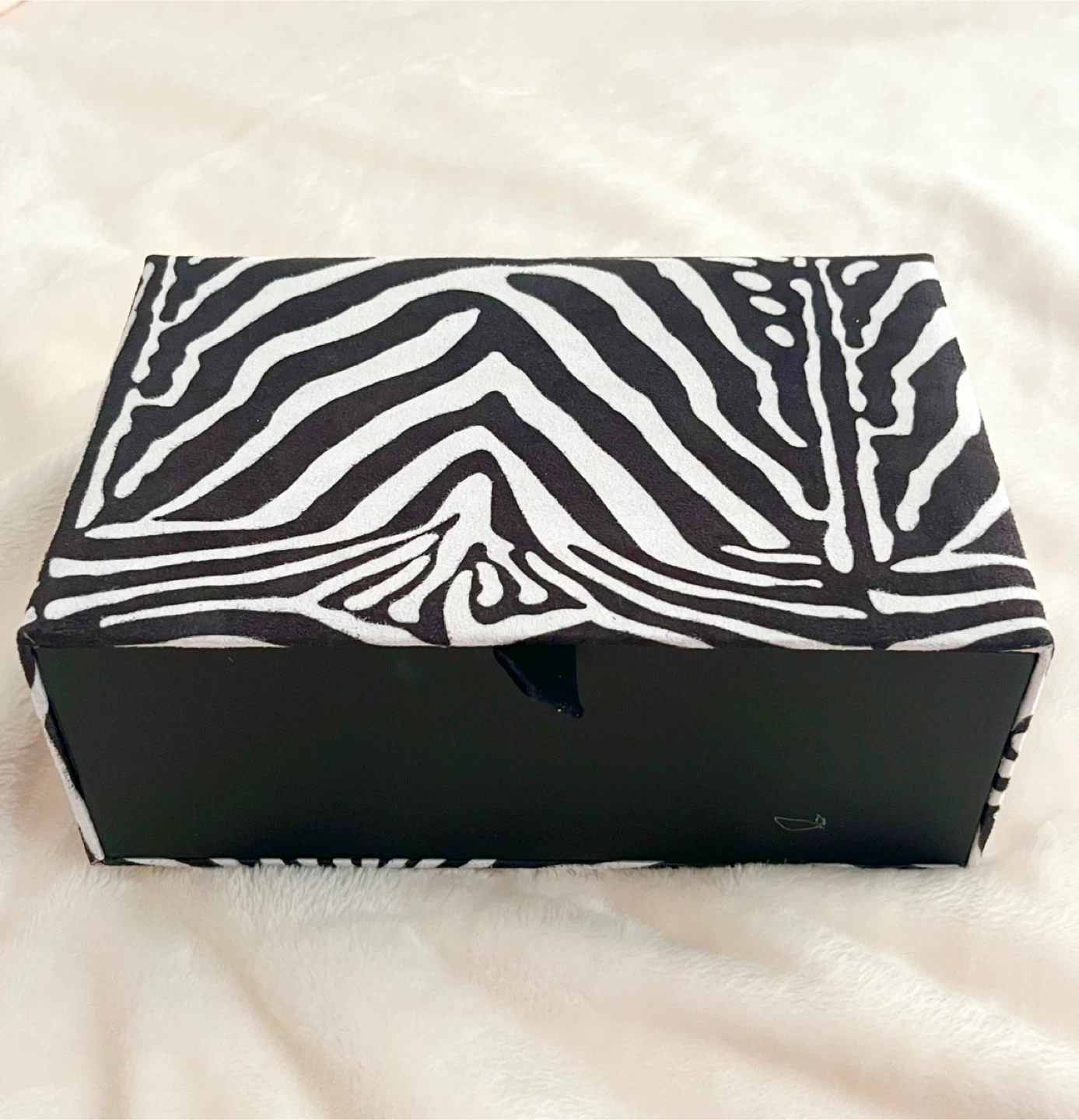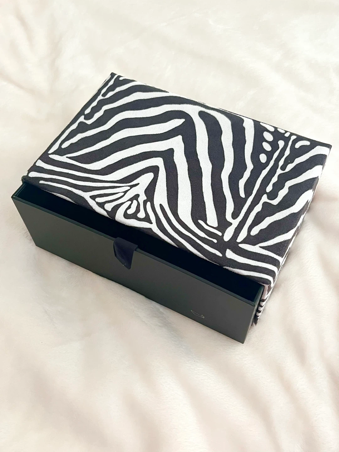 A stylish storage box featuring a bold zebra print exterior. It's perfect for organizing small items like jewelry, makeup, or office supplies. It housed a Guerlain perfume set, but I never stored anything else in it.