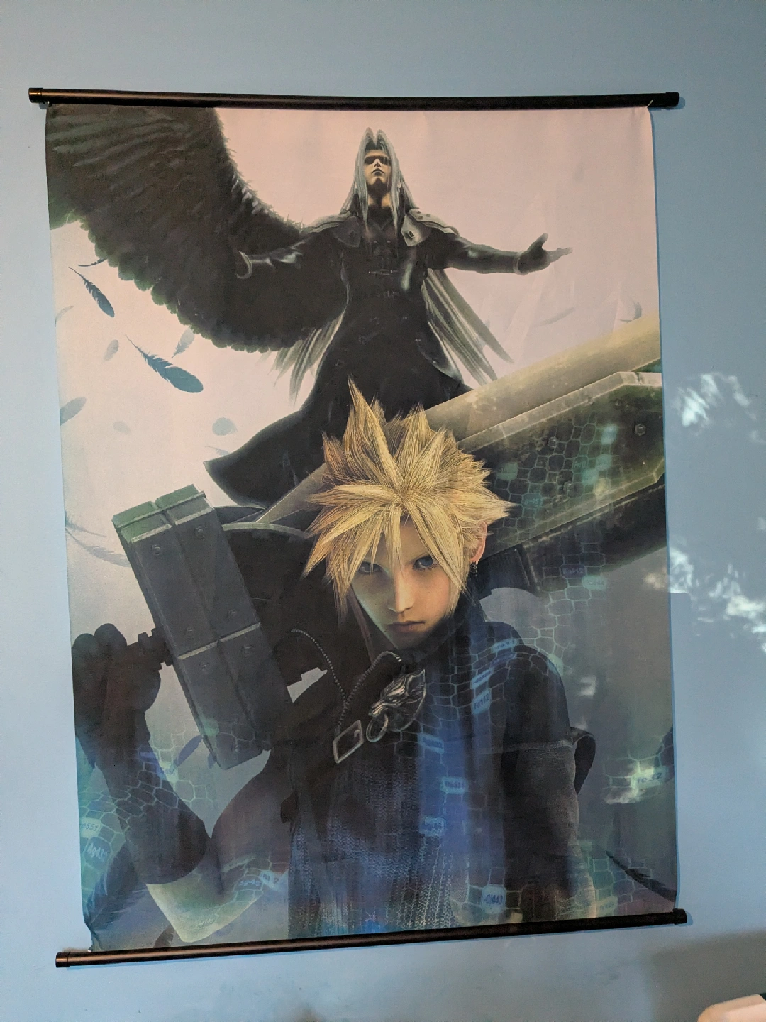 Selling a Final Fantasy VII Remake wall scroll poster featuring Cloud and Sephiroth. It's in great condition and ready to hang in your space!