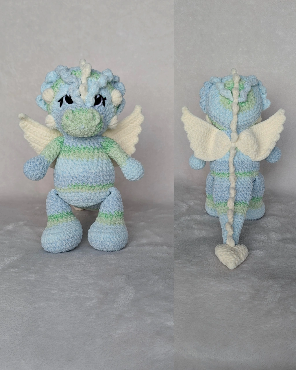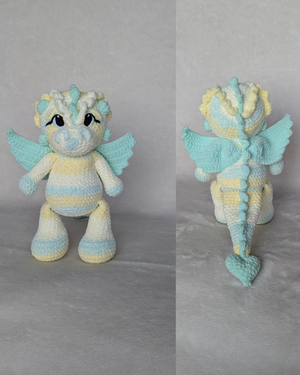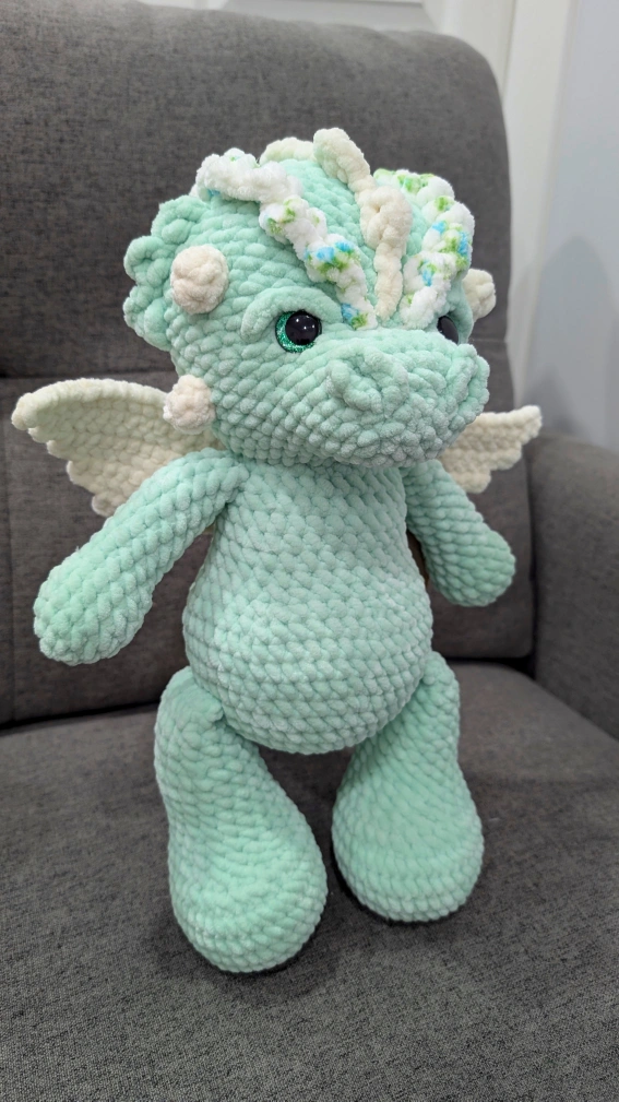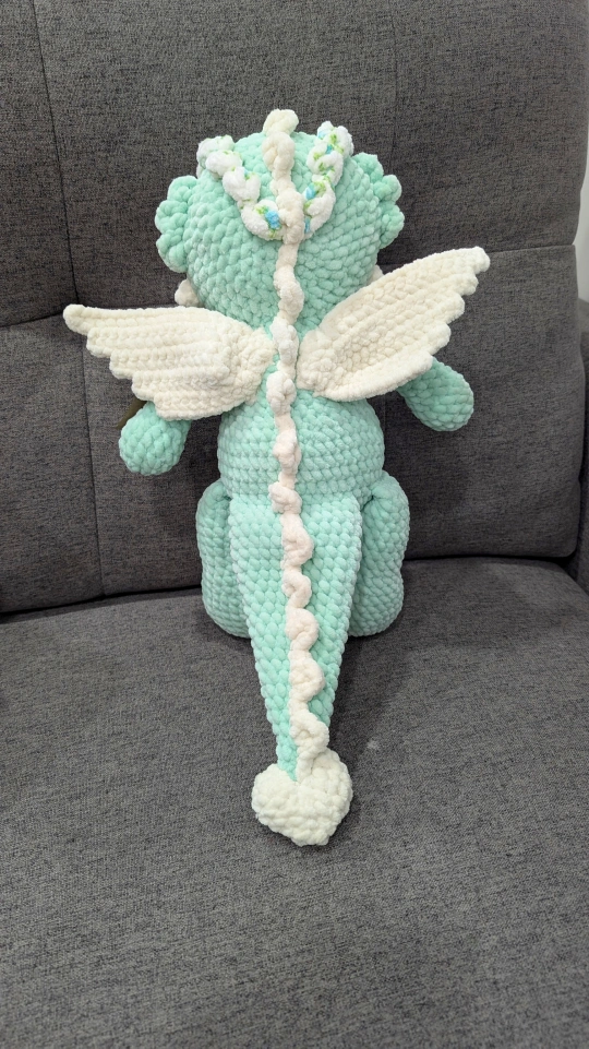 Looking to add a touch of whimsy to your space? Check out this adorable handmade crochet dragon plushie! It's crafted with soft, textured yarn and features cute little wings and a heart-shaped tail. Perfect for adding a pop of colour and charm to any room