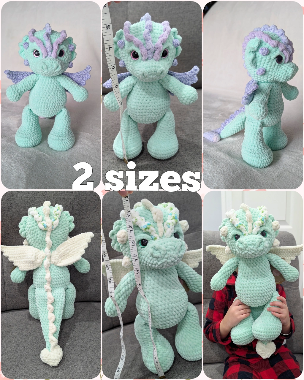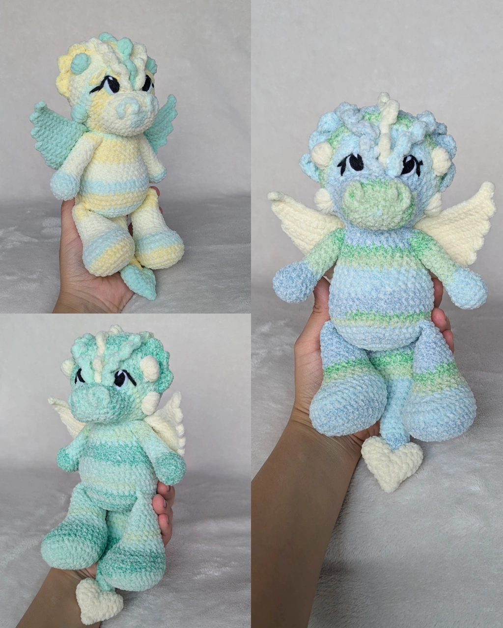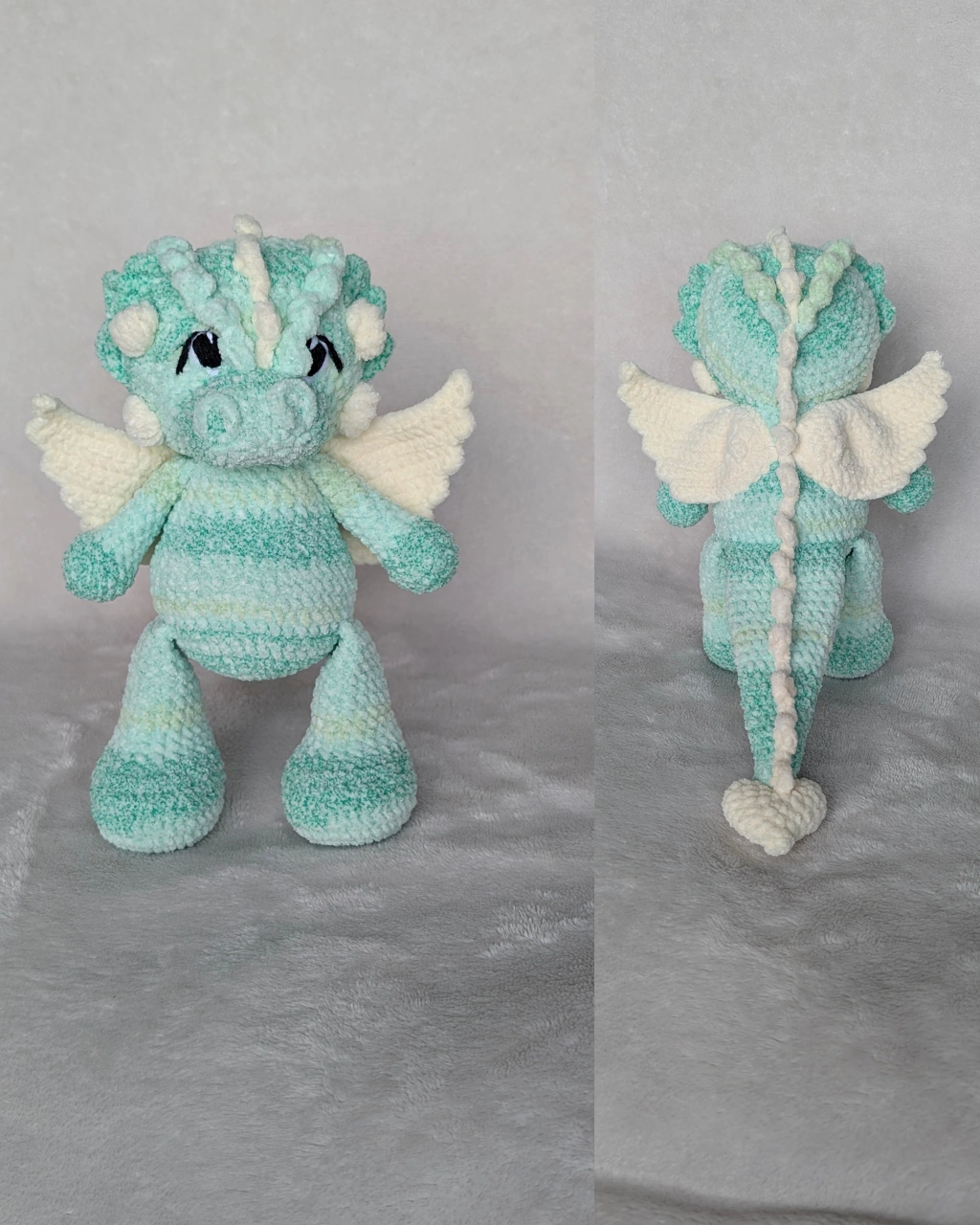 Looking to add a touch of whimsy to your space? Check out this adorable handmade crochet dragon plushie! It's crafted with soft, textured yarn and features cute little wings and a heart-shaped tail. Perfect for adding a pop of colour and charm to any room