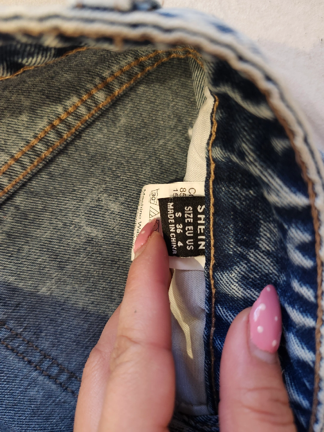 Shein acid wash jeans in size small. They're in great condition and ready for a new home! The jeans have a unique acid wash pattern that gives them a cool, vintage look and are short lenght