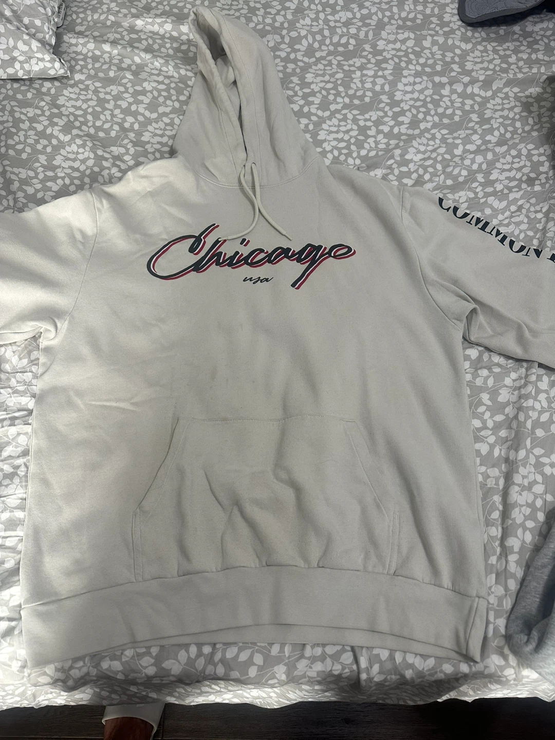 Selling a Common Districts hoodie with "Chicago USA" script on the front and a list of Chicago neighbourhoods on the back and sleeve. It's in great condition and would be a cozy addition to your wardrobe!