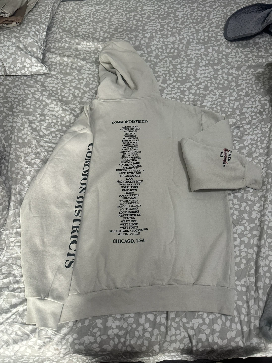 Selling a Common Districts hoodie with "Chicago USA" script on the front and a list of Chicago neighbourhoods on the back and sleeve. It's in great condition and would be a cozy addition to your wardrobe!
