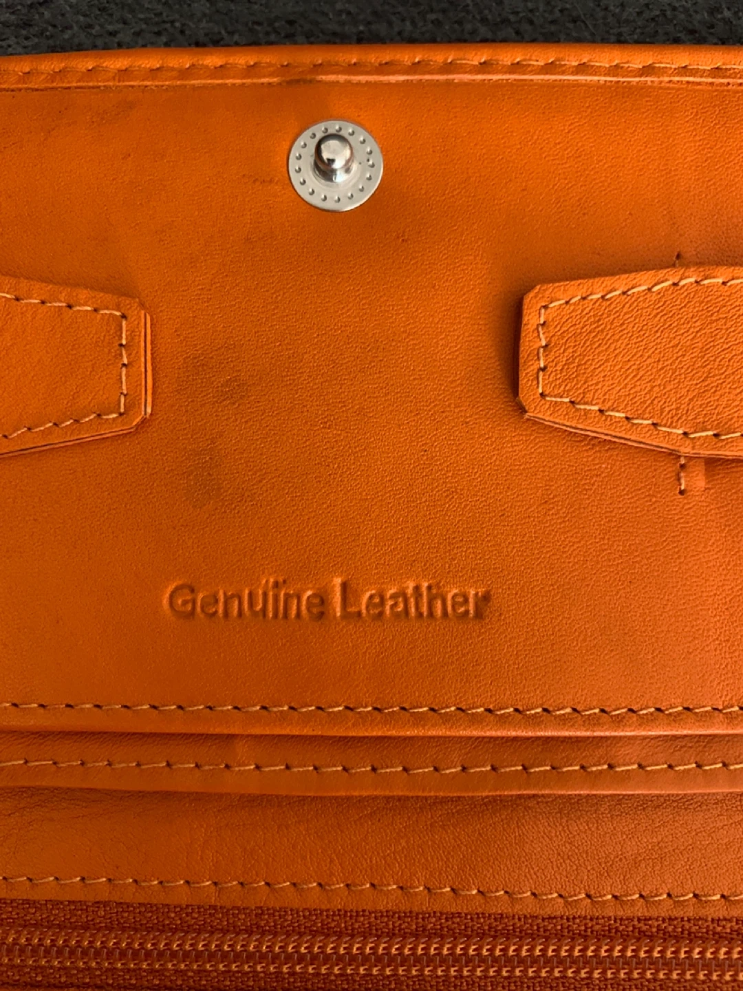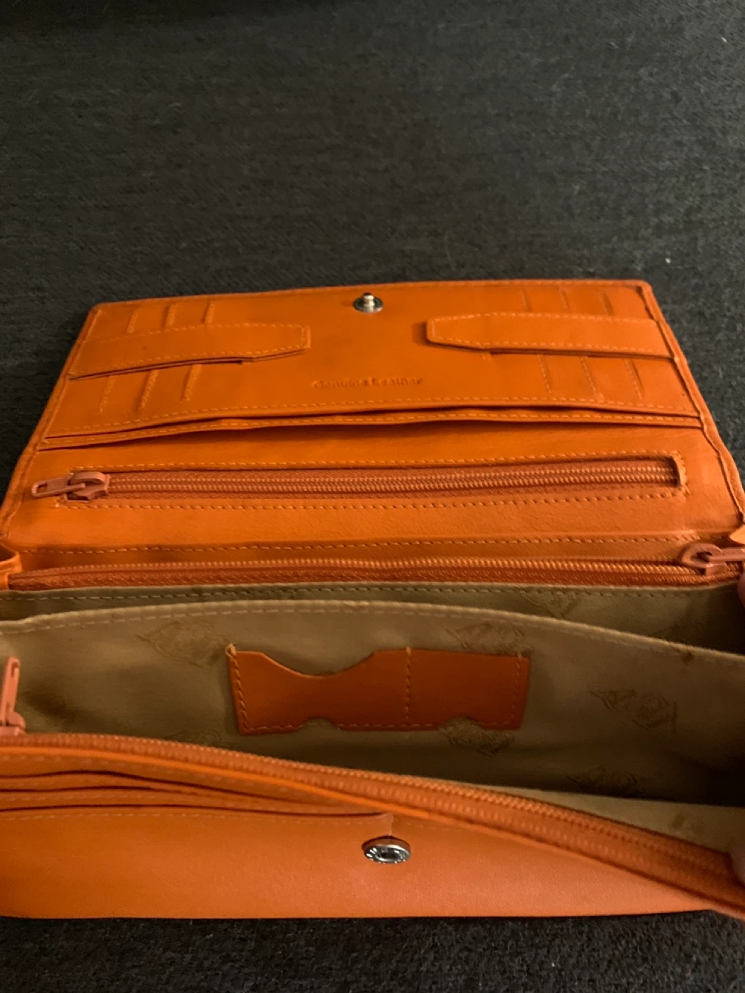 Selling a genuine leather wallet in a vibrant orange colour! It has a zippered compartment and lots of slots for cards and cash. It's in great condition and ready for a new home