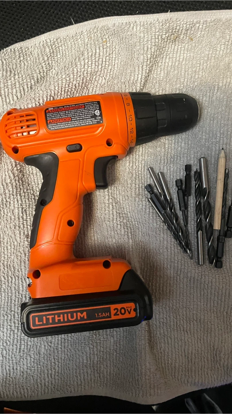 Selling a Black+Decker 20V cordless drill. It comes with a variety of drill bits, so you'll be ready for any project around the house. The battery is a 20V Max Lithium 1.5Ah battery. Great for DIY projects!