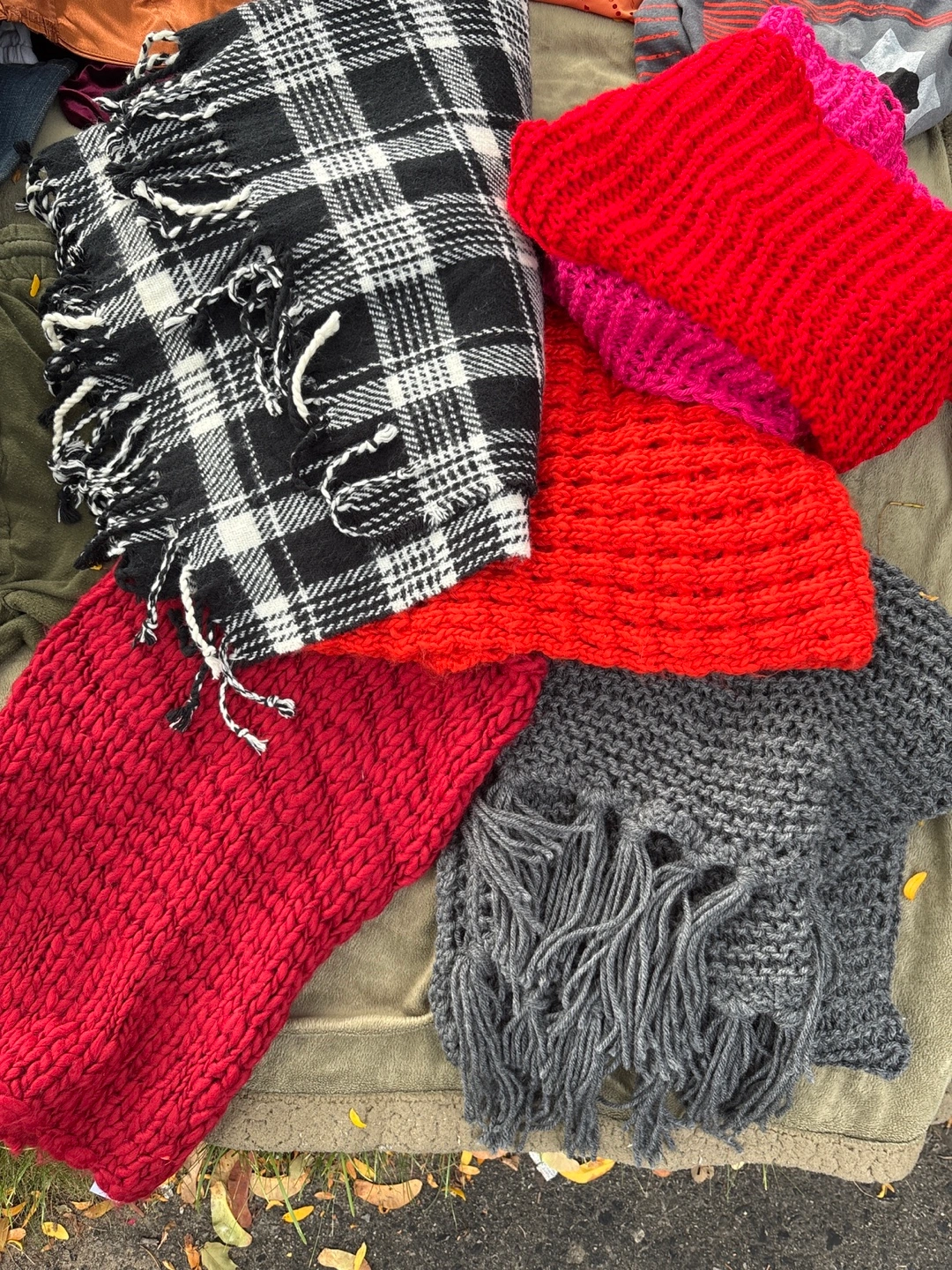 183Got a bunch of scarves up for grabs! There's a black and white plaid one with fringe, plus some cozy knitted ones in red, pink, and grey. Perfect for staying warm and stylish this fall and winter! $5 each