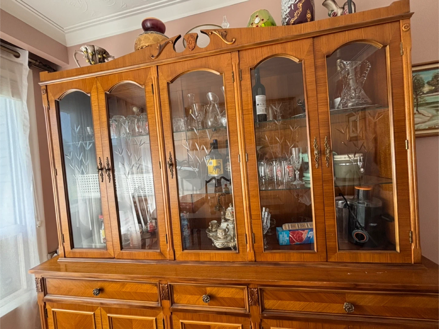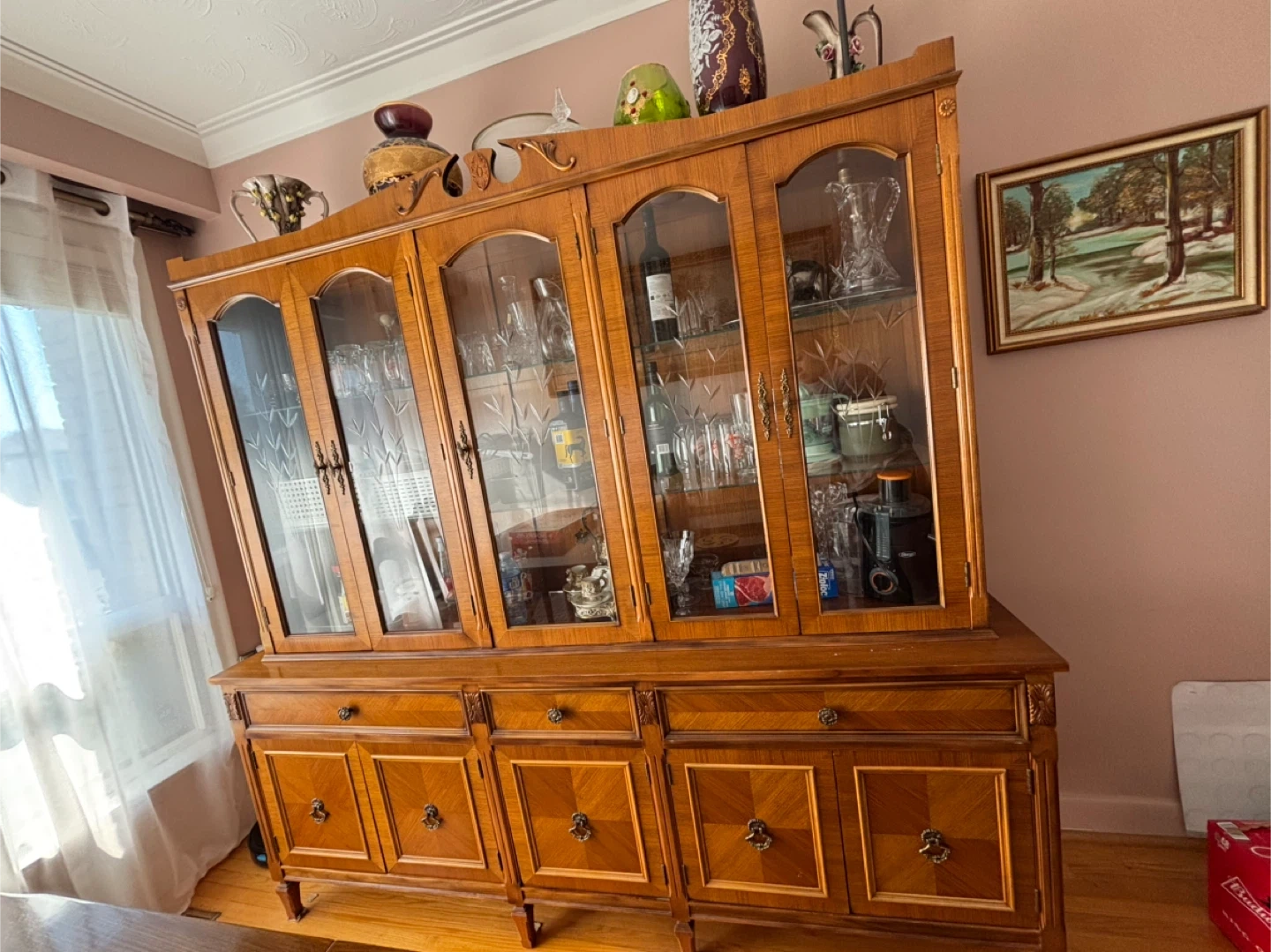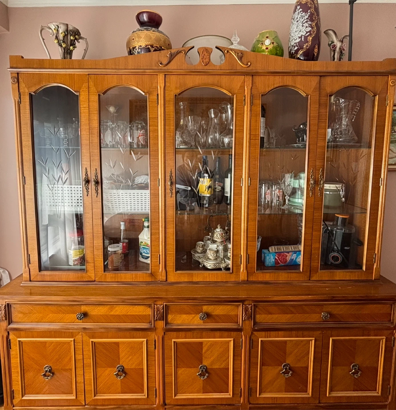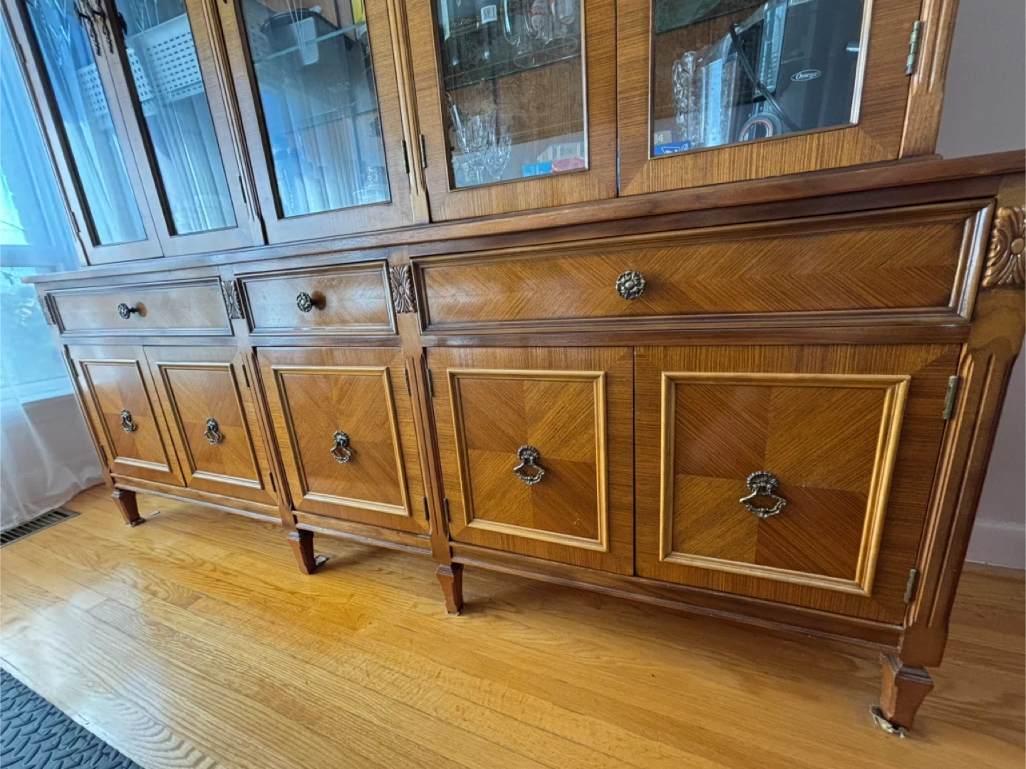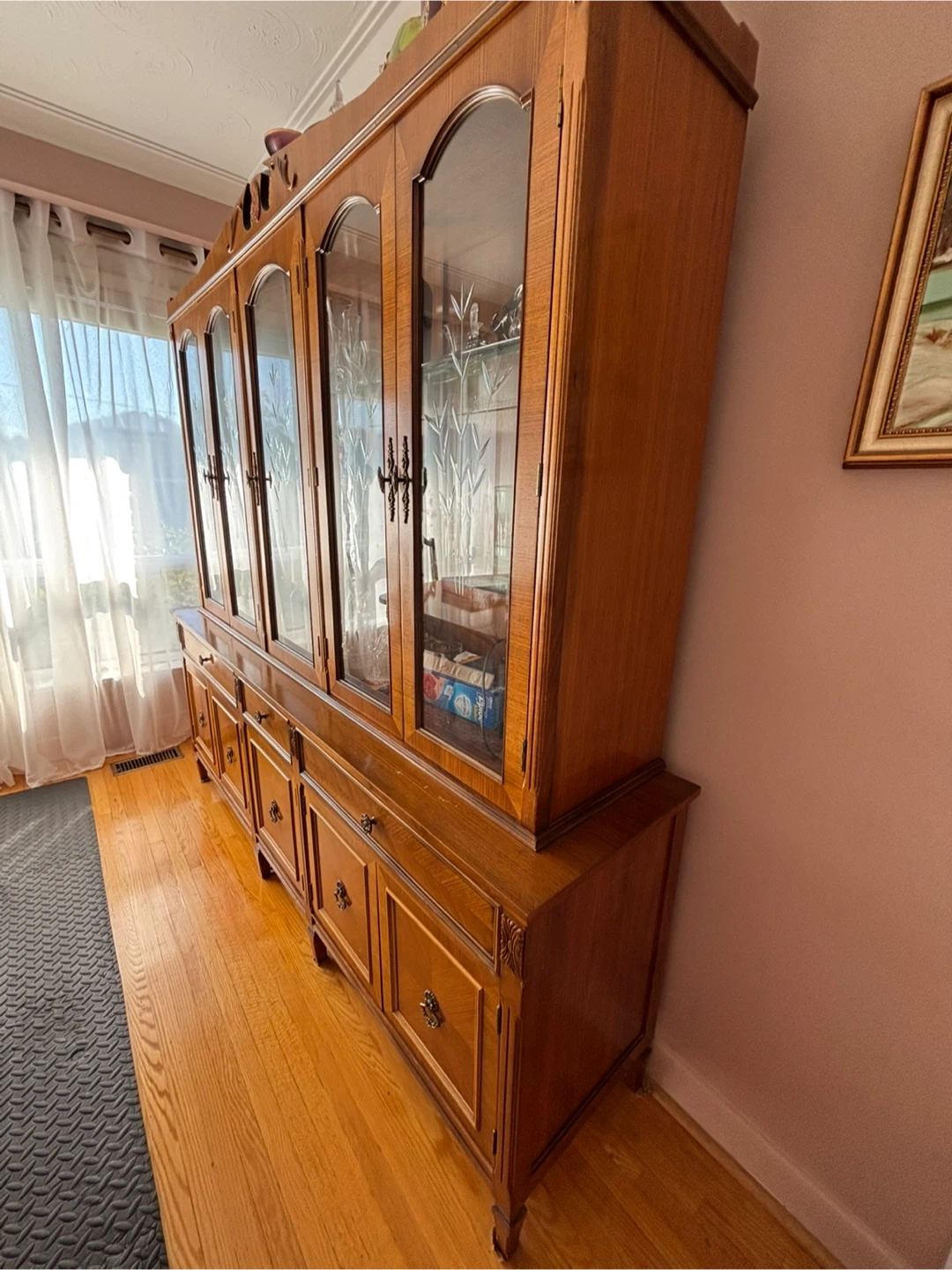 Selling a beautiful vintage china cabinet. It features glass doors on the upper section and wooden doors and drawers on the lower section. It's a great piece for displaying your fine china and storing your dining essentials. It's in good condition and ready for a new home!