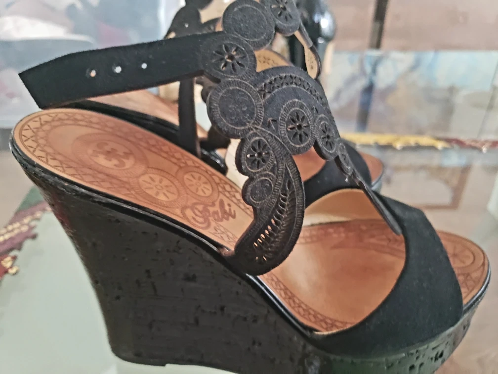 These Fabi italian wedge sandals are a stylish addition to any wardrobe! They feature a unique laser-cut design on black leather. Perfect for dressing up or down. Original price $350 . Wore once
