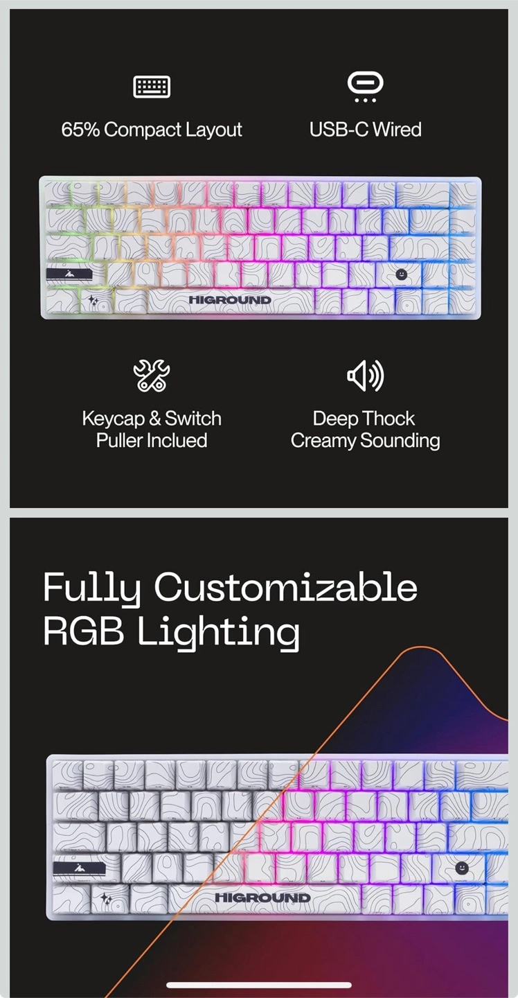 Selling a brand new Higround Topo Base 65 keyboard! It features a 65% compact layout and connects via USB-C. Also included is a keycap & switch puller. The keyboard has fully customizable RGB lighting and a deep, creamy sound. The box is included!