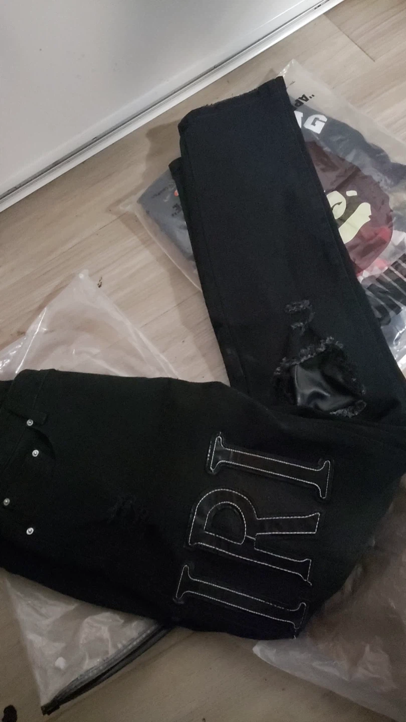 Selling a pair of black jeans with 'Amiri printed on the leg. They have a distressed look with some rips.