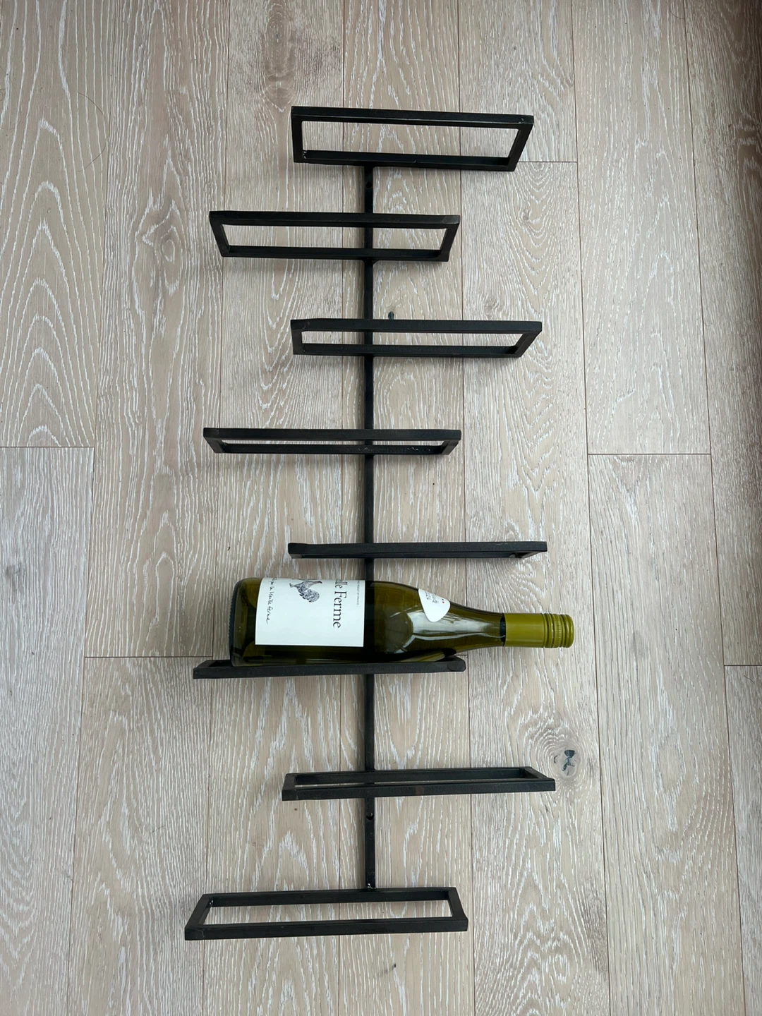 Rod iron wall wine rack – holds 8 bottles. Easy to mount on the wall, sturdy and stylish. Measures 28” x 12”. Great for saving space and displaying your wine.