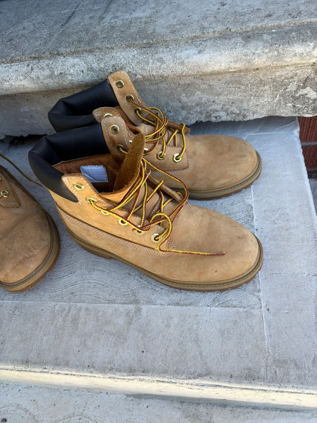 Selling a pair of Timberland boots! They are in good condition and have the classic Timberland look with the tan colour and yellow and red laces. Perfect for everyday wear!