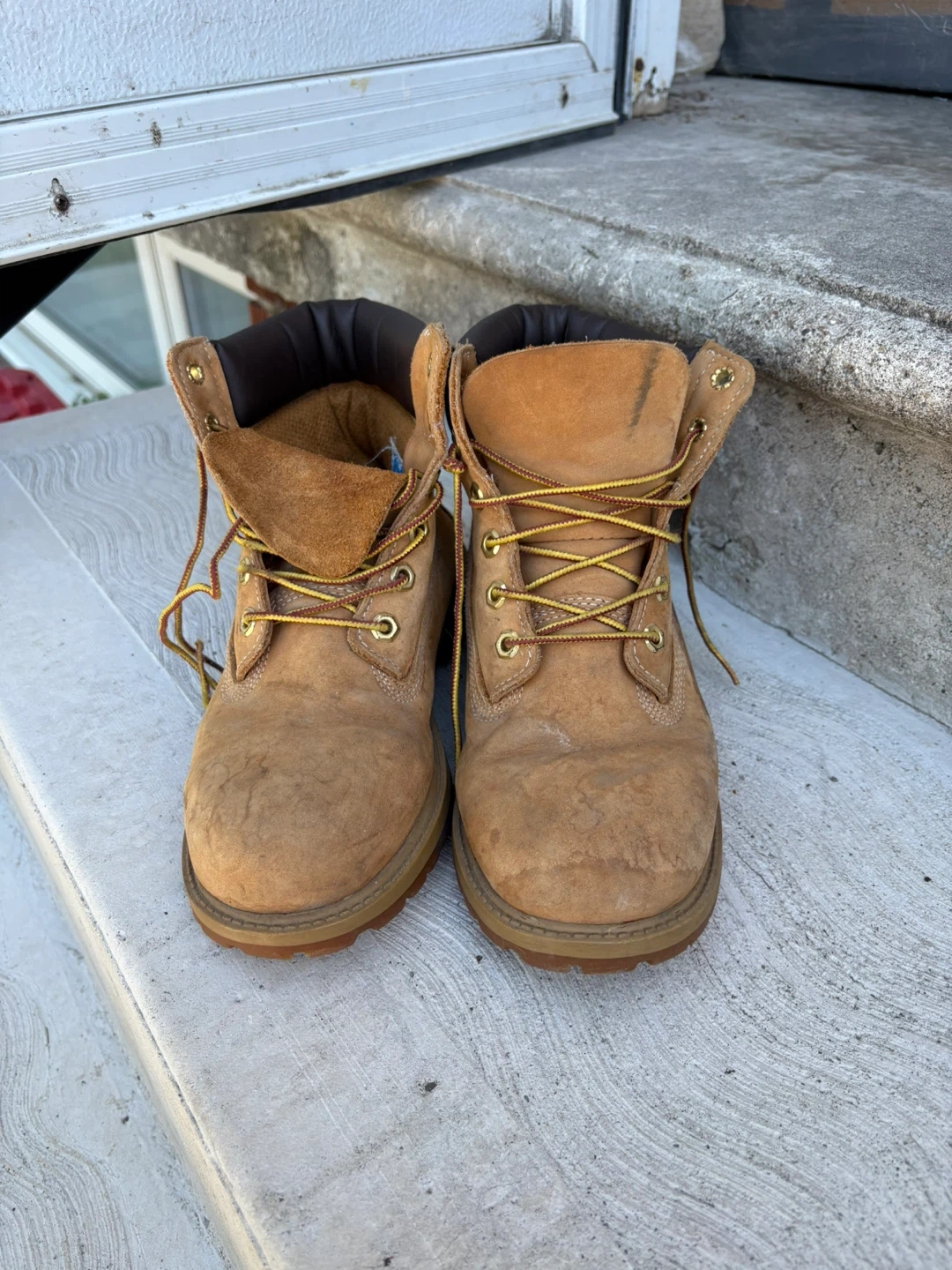 Selling a pair of Timberland boots. They are a tan colour and show some signs of wear. Great for outdoor activities or everyday use!