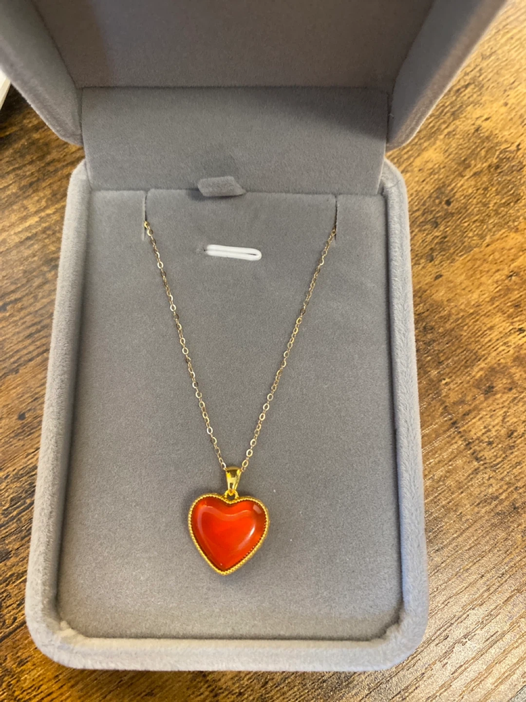 The necklace is about 45cm long and is all 18k gold except for the heart which is half garnet and half mother of pearl.