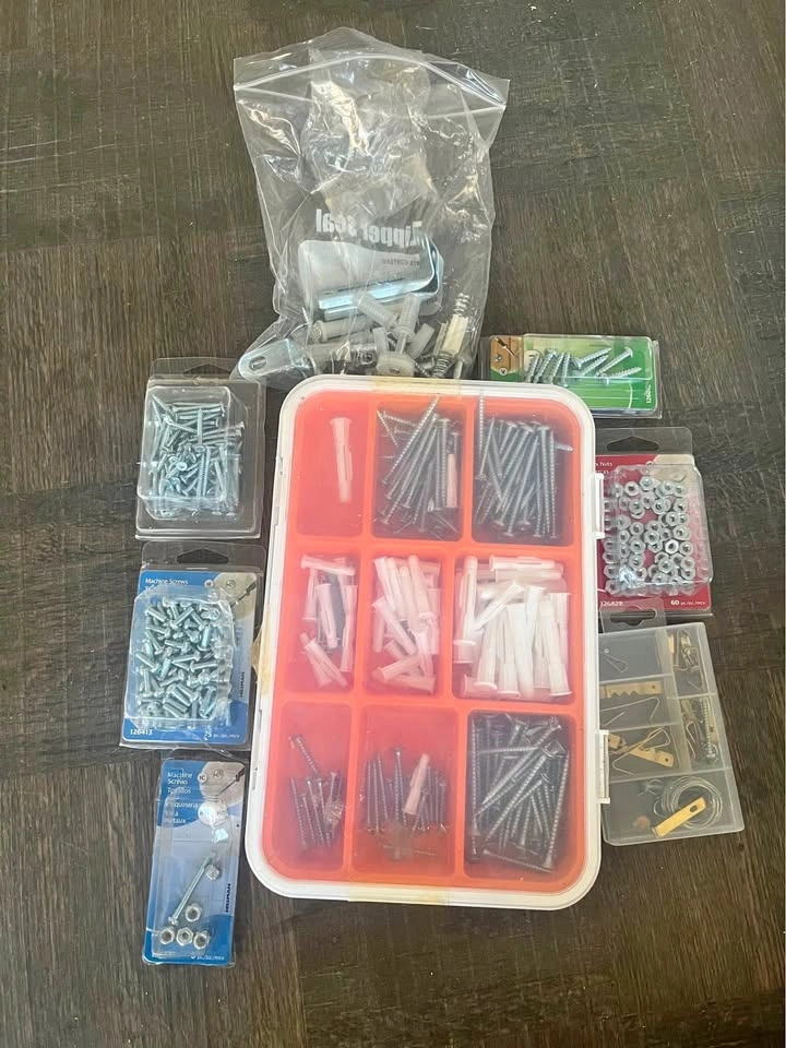 25Large mixed lot of hardware: screws, wall anchors, washers, nuts, hooks, and organizers. Perfect for home projects, carpentry, and repairs.