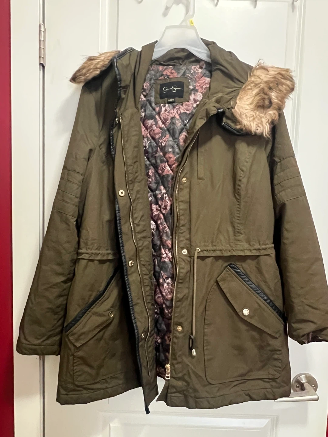 Stay warm and stylish with this Jessica Simpson winter coat! It's an olive green colour and a size XL Features a faux fur hood and a floral lining. Perfect for those chilly Canadian days!