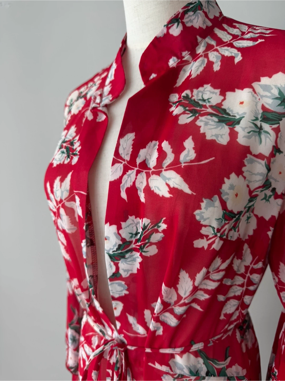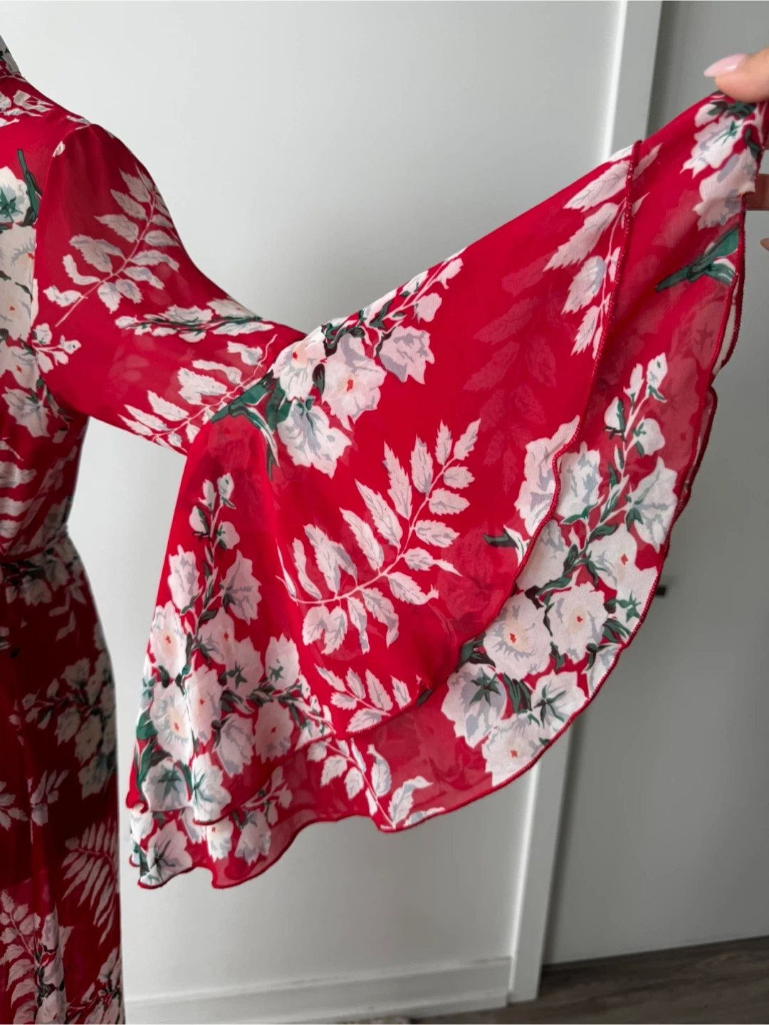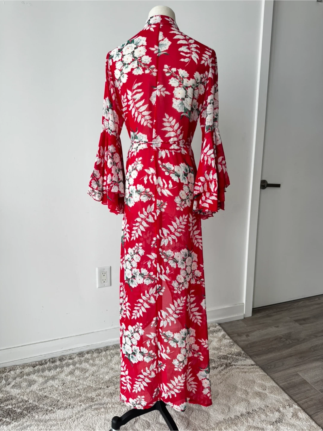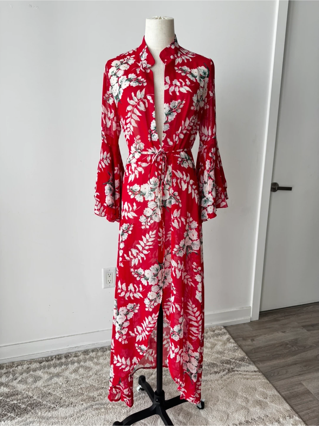 Beautiful red maxi cover up with a white floral print! It features long sleeves with a bell sleeve detail. Perfect for a special occasion or a night out