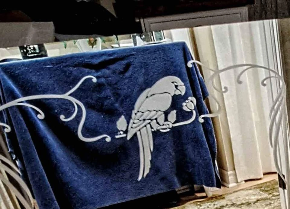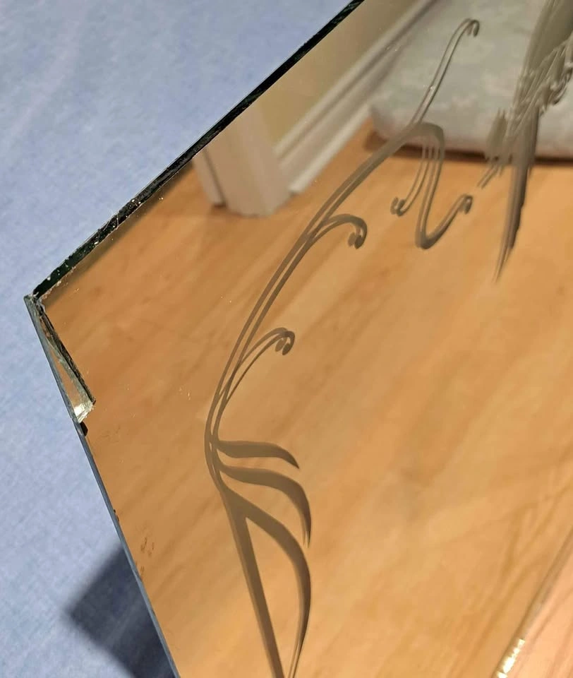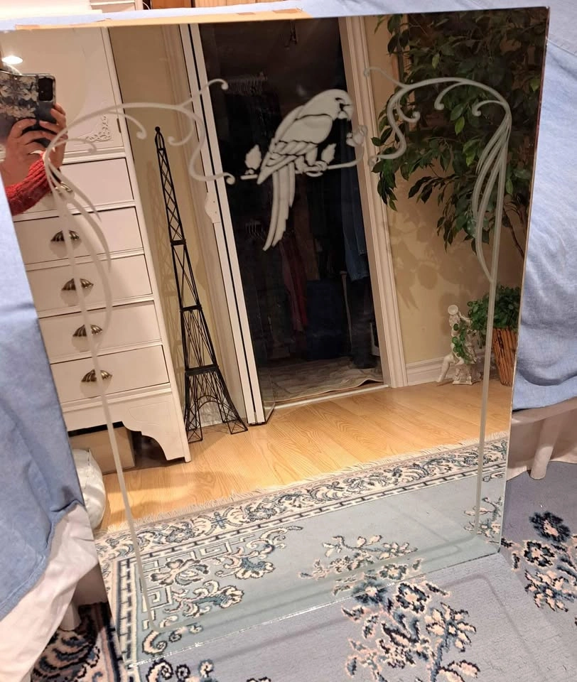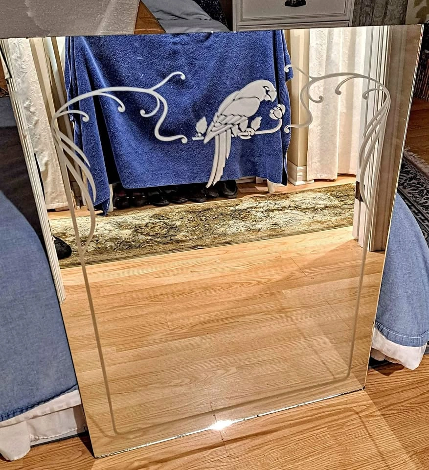 Large mirror with parrot etching. Upper left side has a broken off piece which was glued back on . Would be hidden by a frame. No hooks on back.