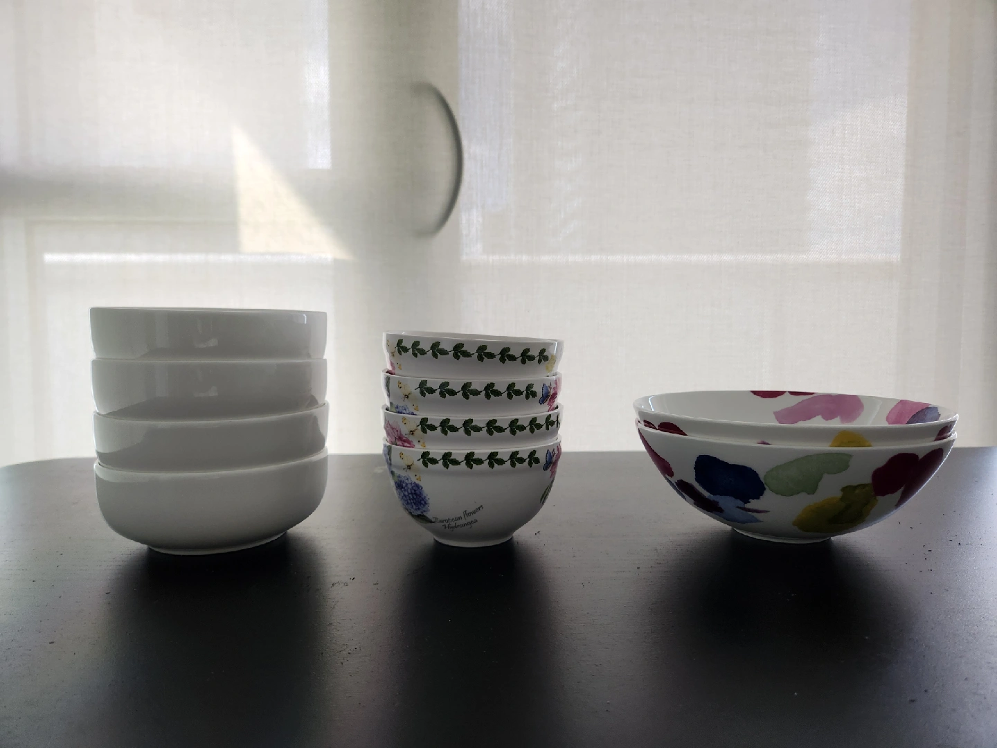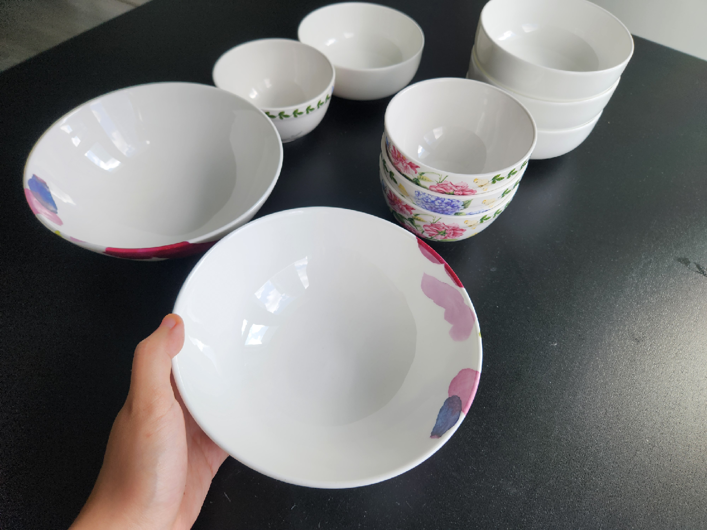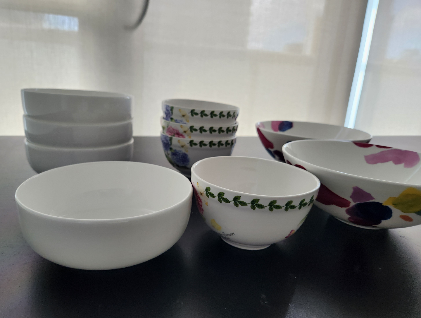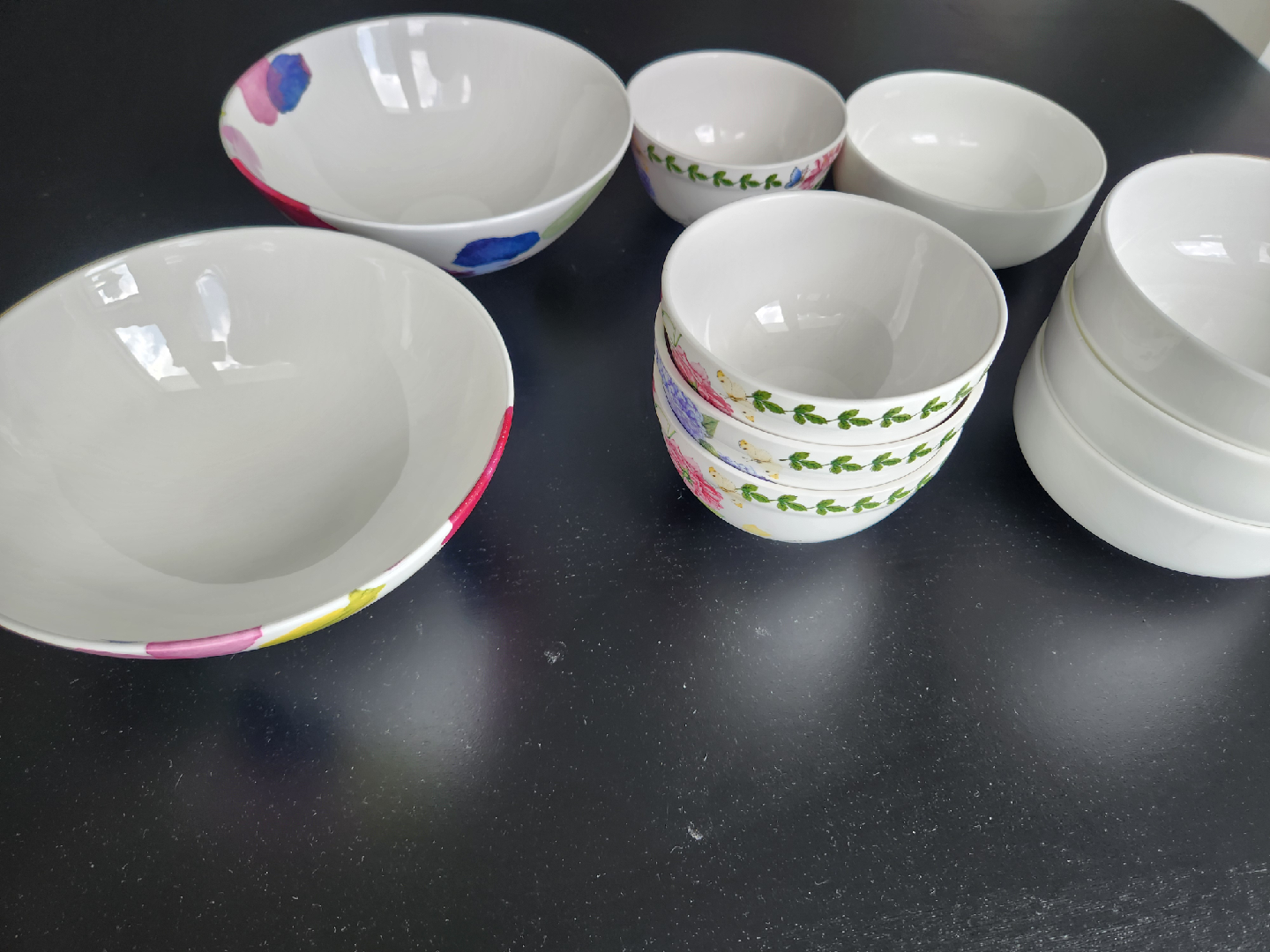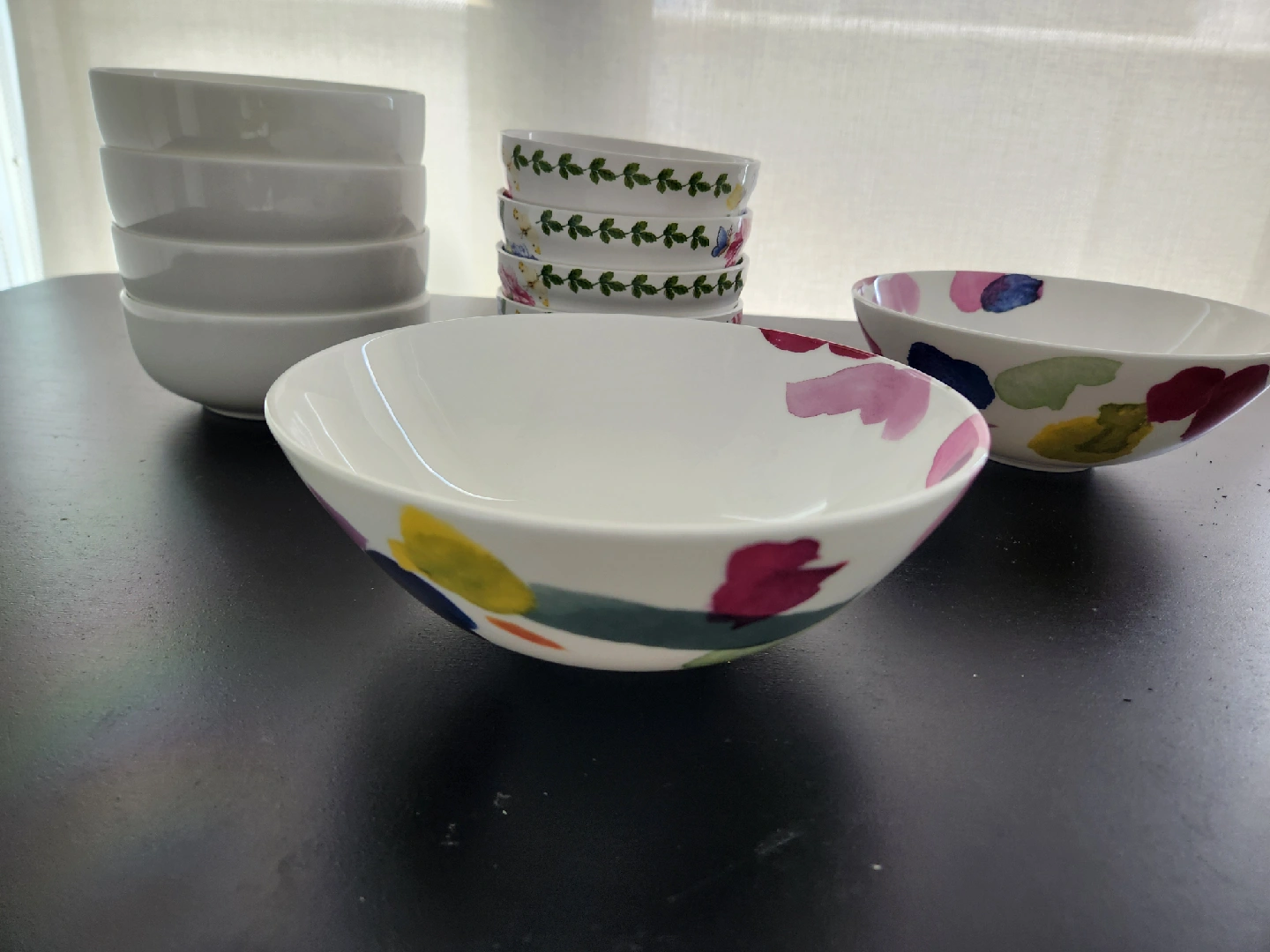Selling a set of bowls in great condition! There are three different patterns: floral, foliage, and solid white. Total of 10 bowls. Perfect for everyday use or special occasions. Take everything for $5