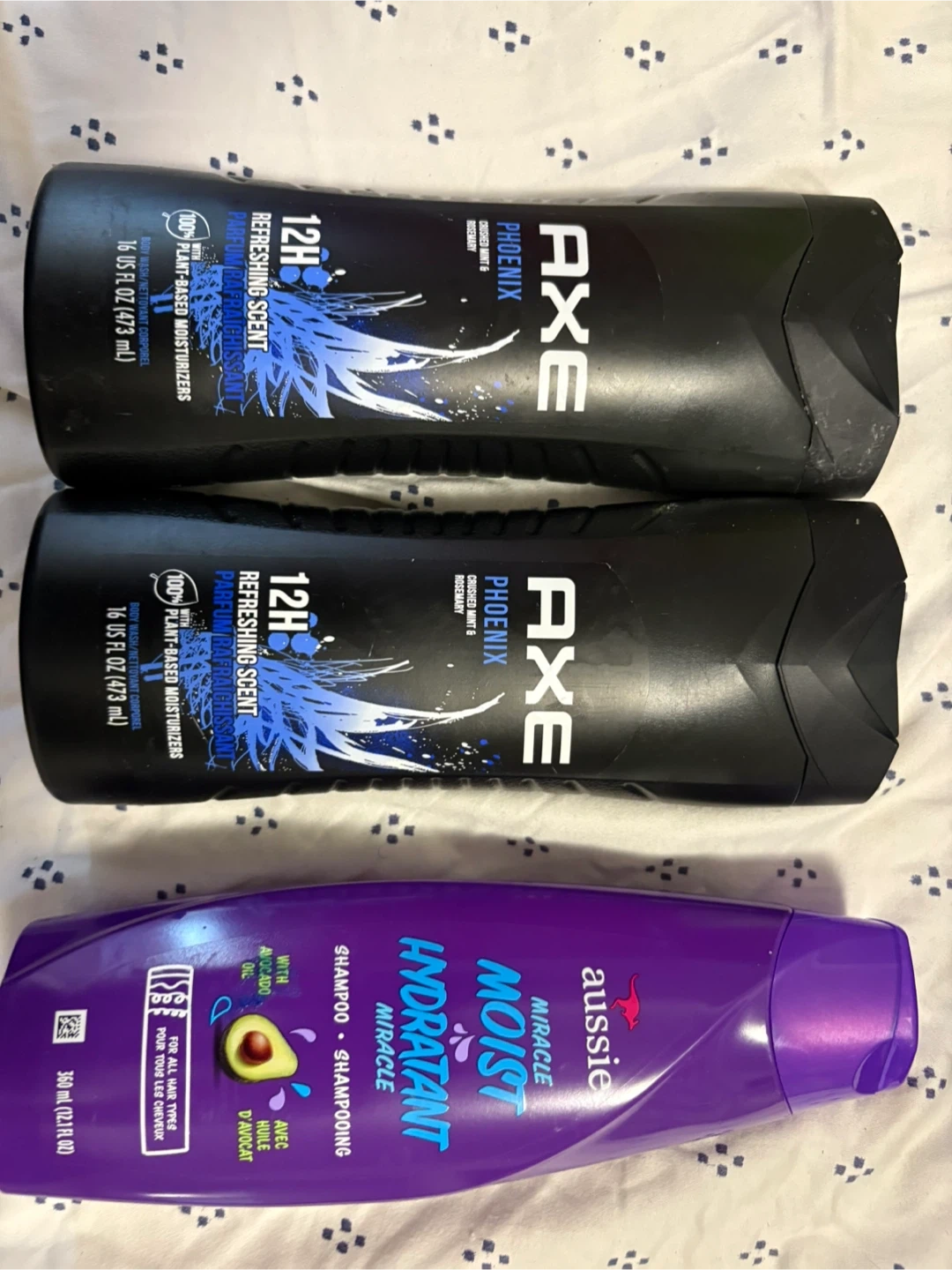 Selling two bottles of Axe Phoenix body wash (16 US fl oz / 473 mL) with a refreshing 12-hour scent. Also included is a bottle of Aussie Miracle Moist shampoo (360 ml / 12.1 fl oz), perfect for all hair types and enriched with avocado oil 4 dollars each