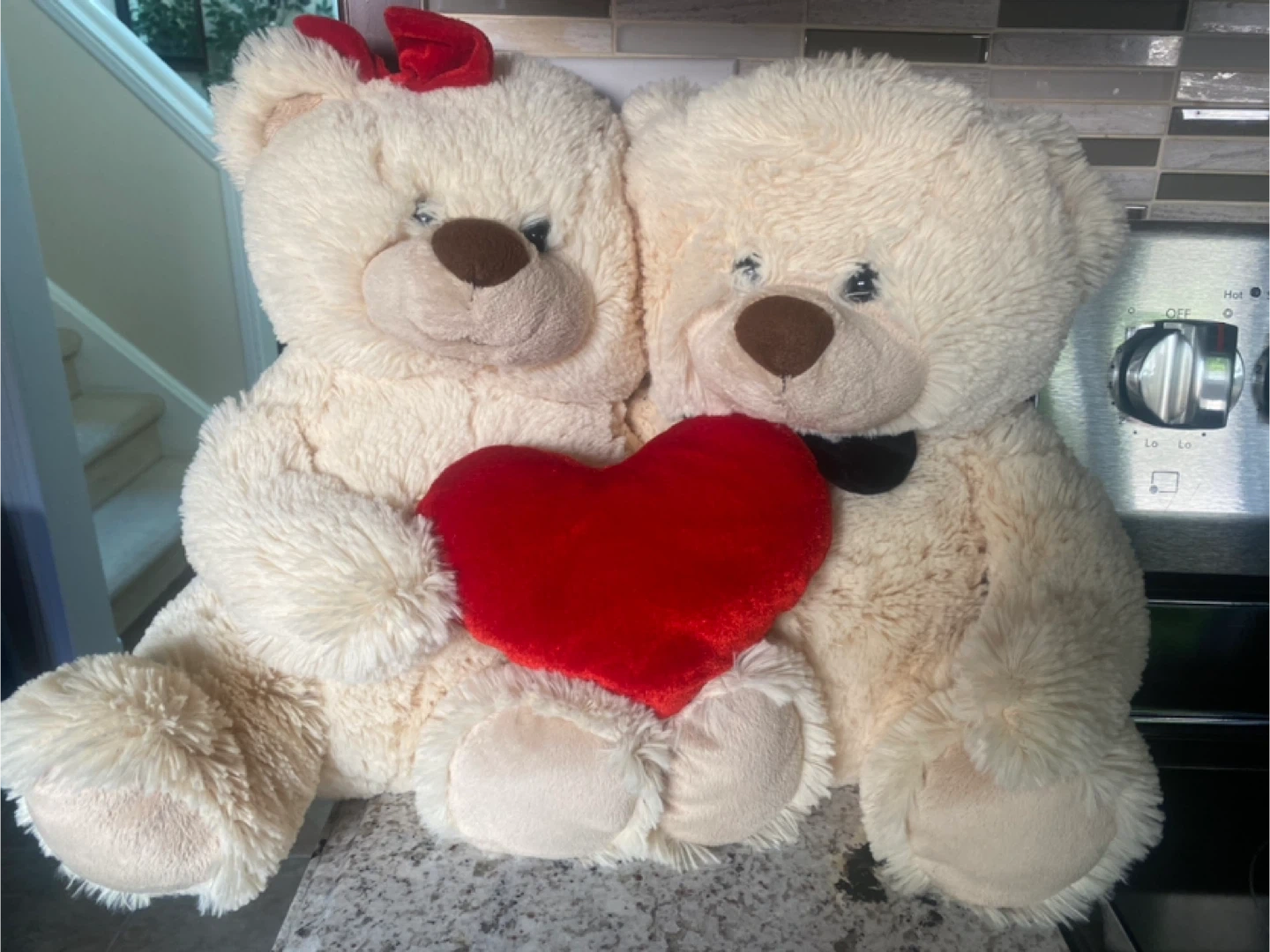 A pair of adorable plush bears, perfect for Valentine's Day! One bear has a red bow and the other has a black bow tie. They are hugging each other and holding a red heart. These bears are in great condition and ready to spread some love 2 pickup locations available in Rexdale and Bolton. Let me know which works for you