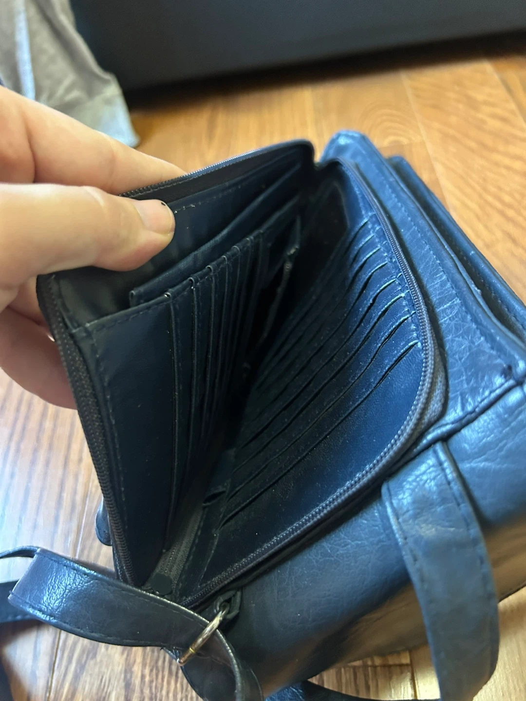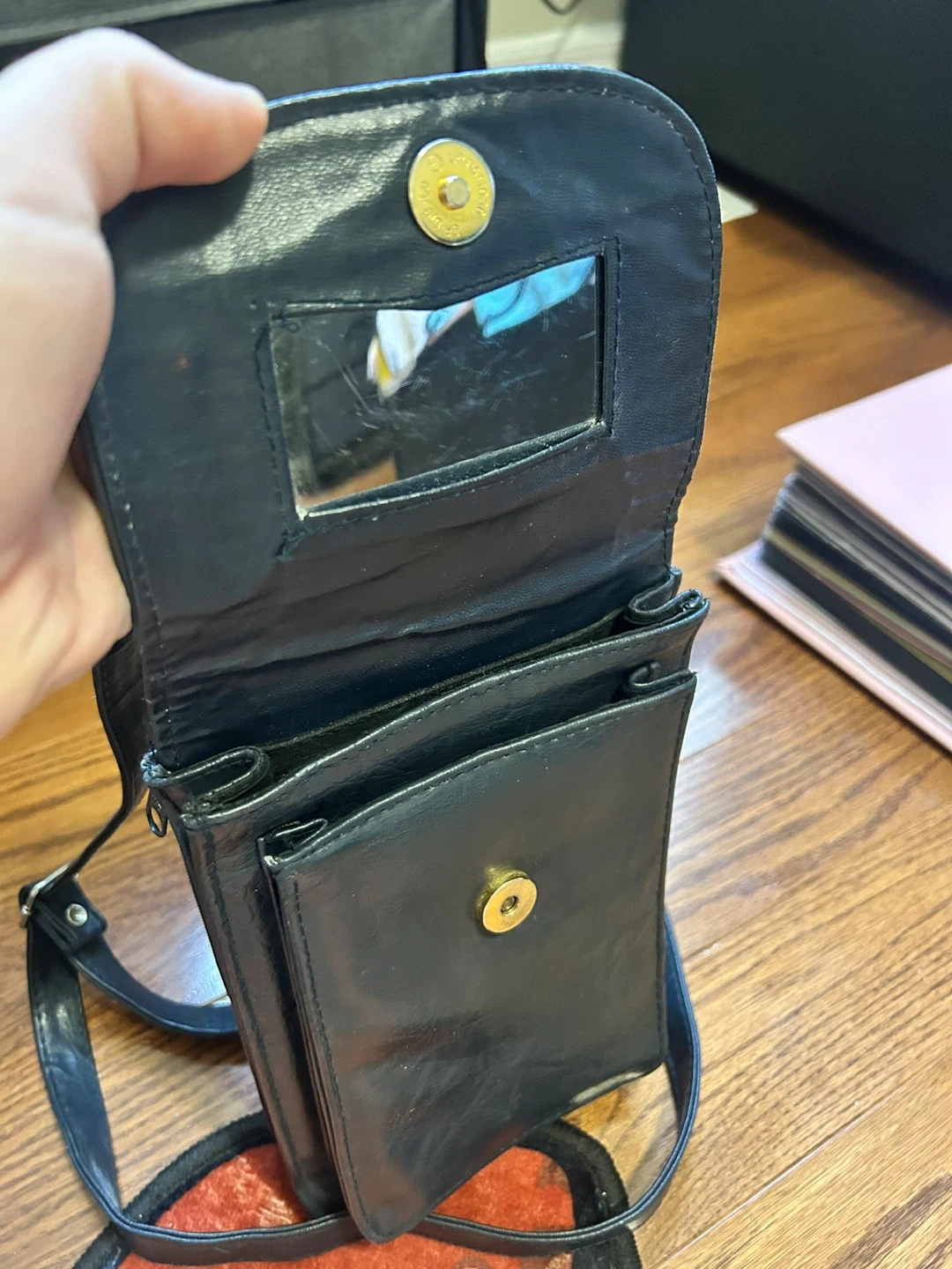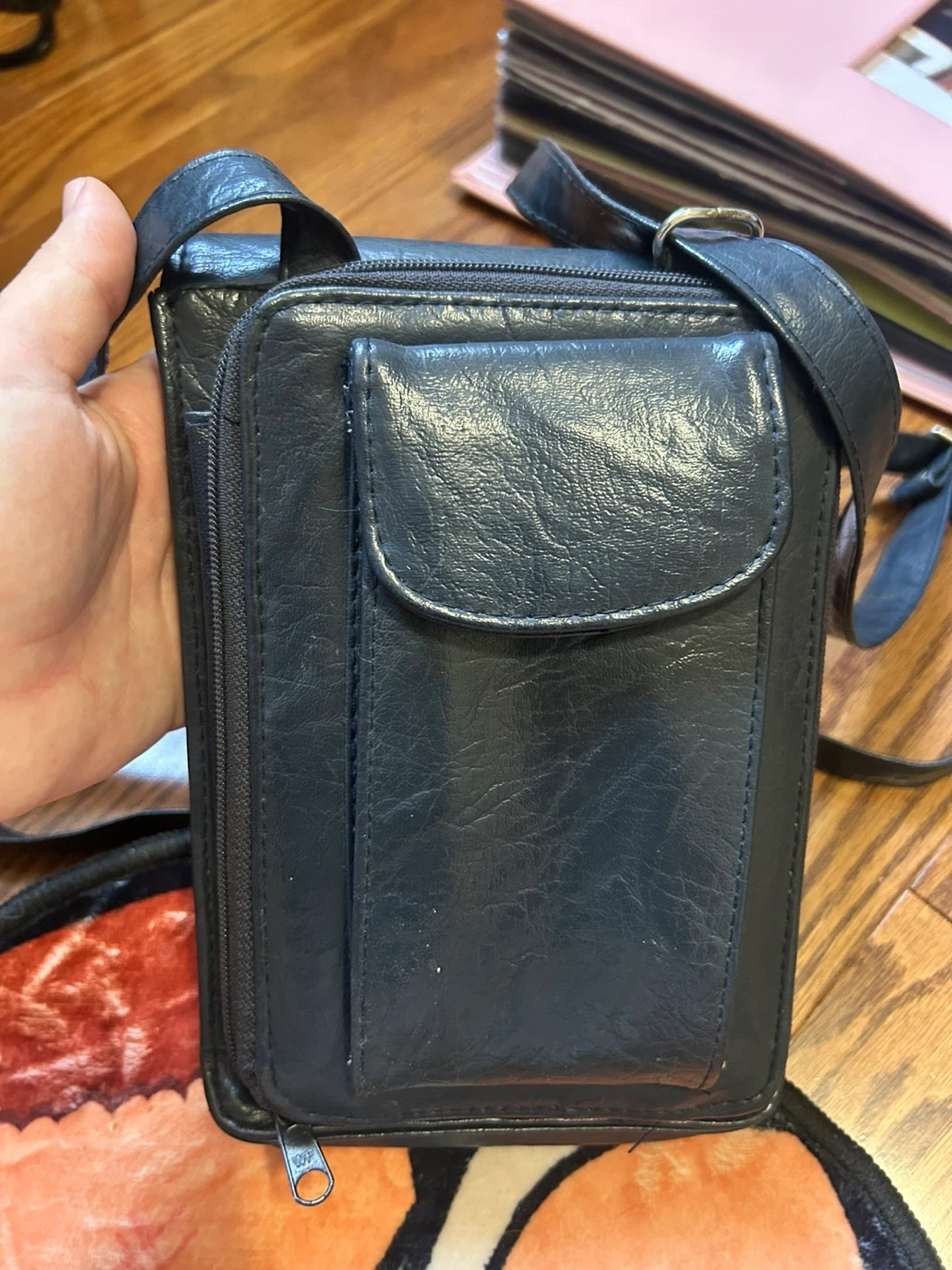 Selling a cute little black leather crossbody bag by Allasandro! It has a lot of compartments and card slots, perfect for keeping organized. It's in great condition and ready for a new home